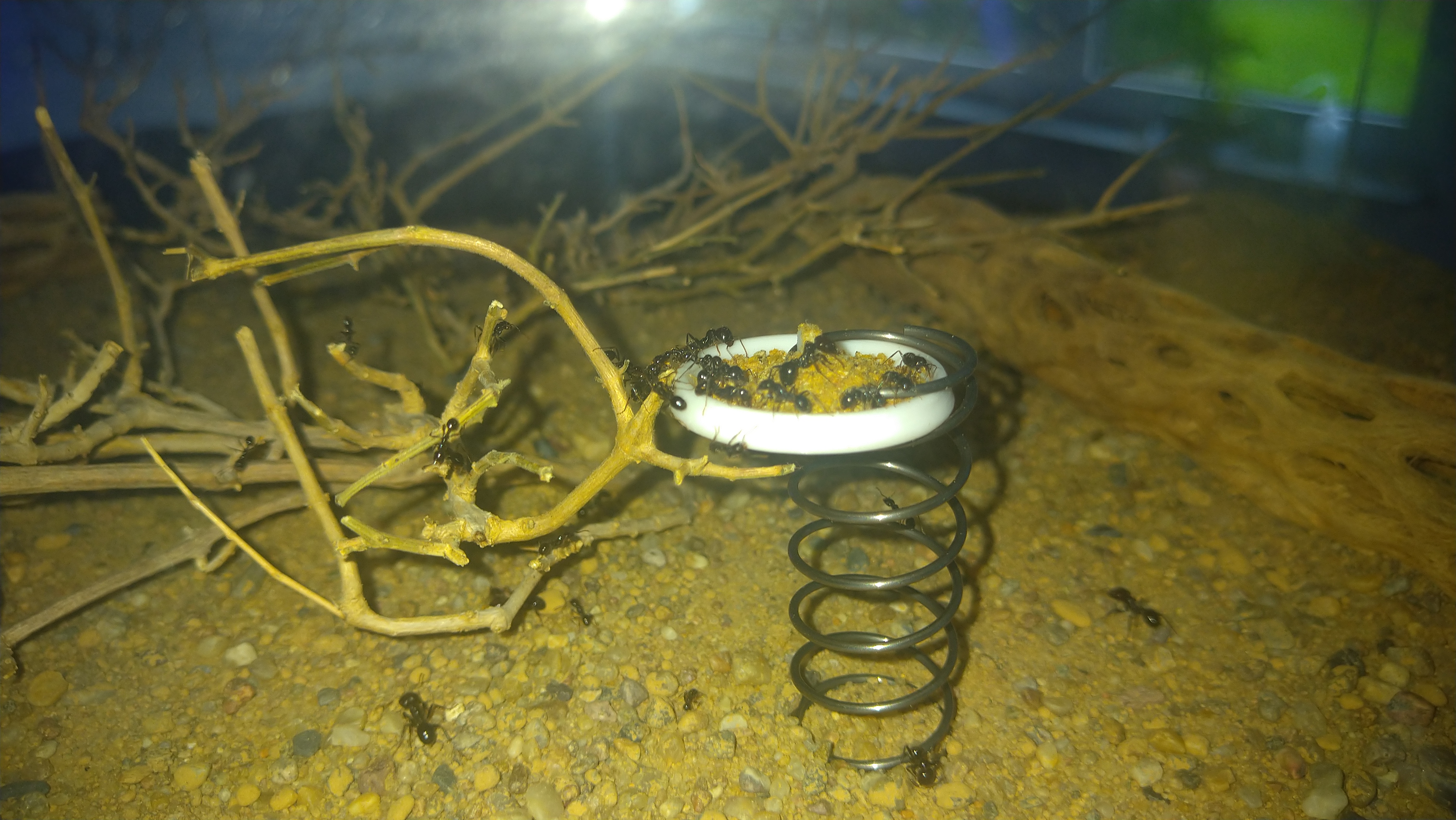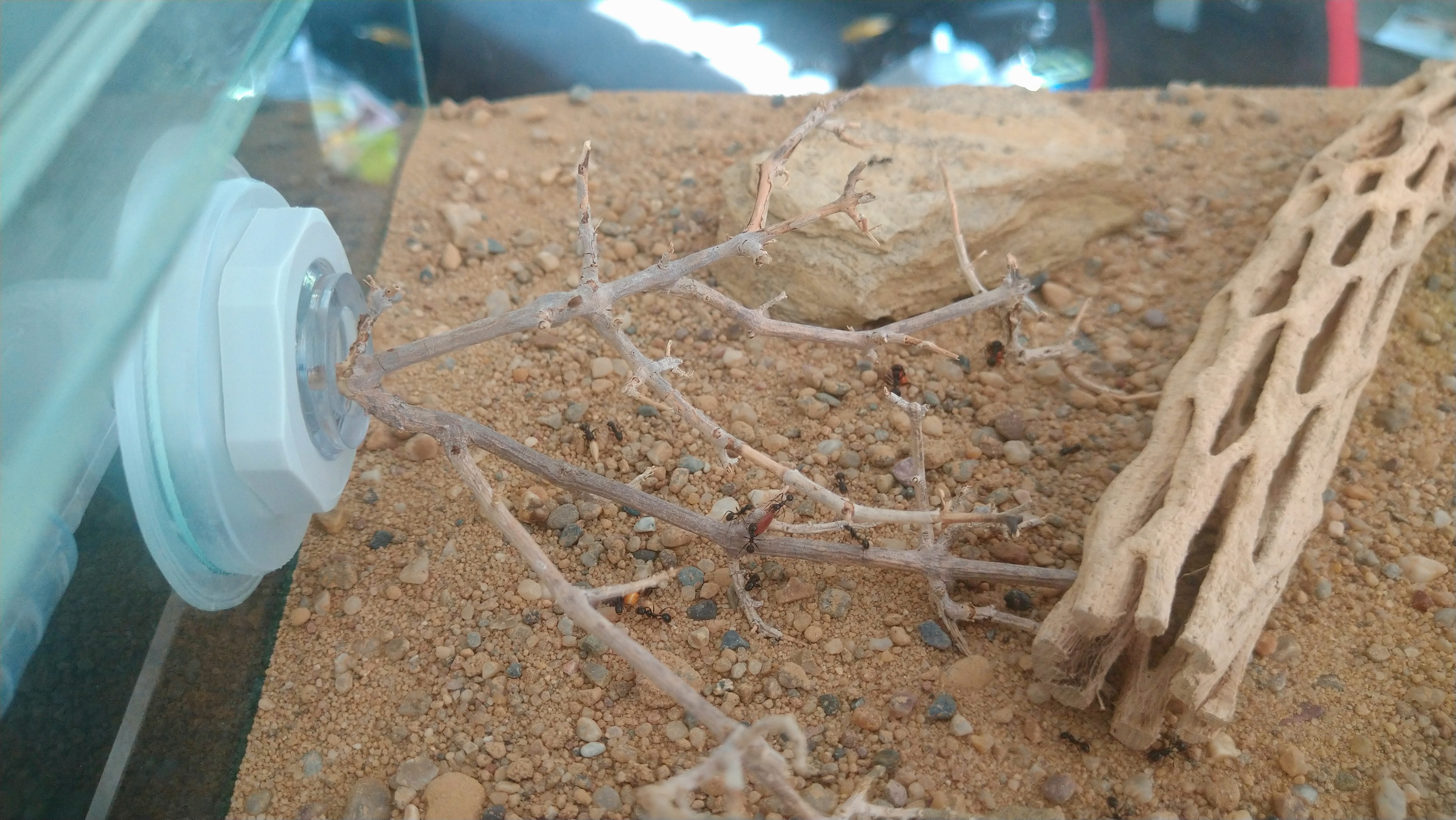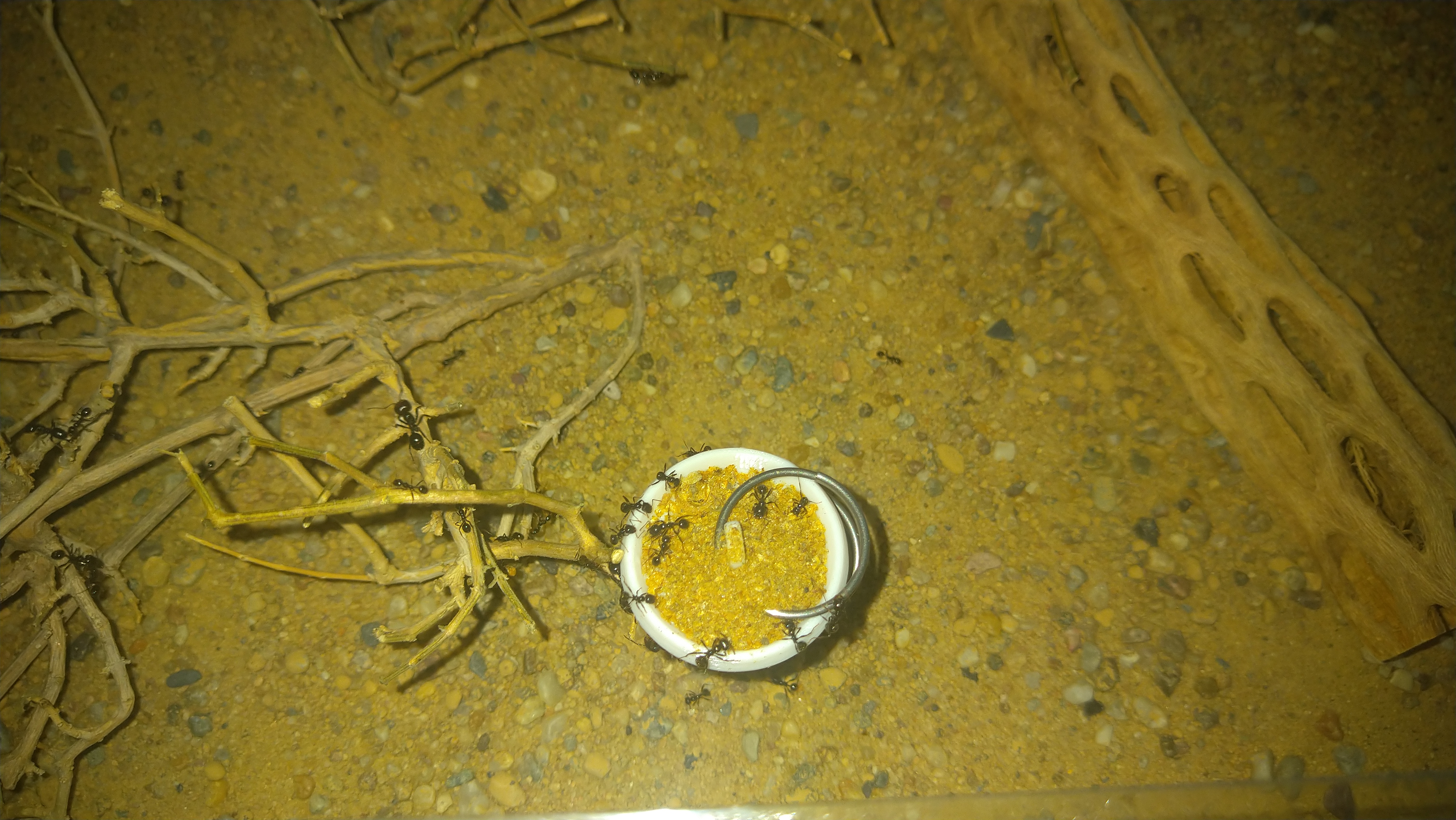 Da die eine Arena oft komplett durchquert werden muss und zur nächsten zu kommen, hat sich hier schon eine Straße gebildet. Erkennt man etwas daran das entweder der Boden Grund komplett abgetragen wurde oder sämtliche größere Steinchen aus dem Weg geräumt wurden. Zu meiner Wurzel Pflanze brauch ich wohl nichts mehr sagen. Unter dem linken Stein am Eingang sitzen immer um die 100Arbeiterinnen. Scheint eine Art Außenposten zu sein. Bei Erschütterung oder wenn ich das Wasser wieder auffülle, rücken die immer sofort aus