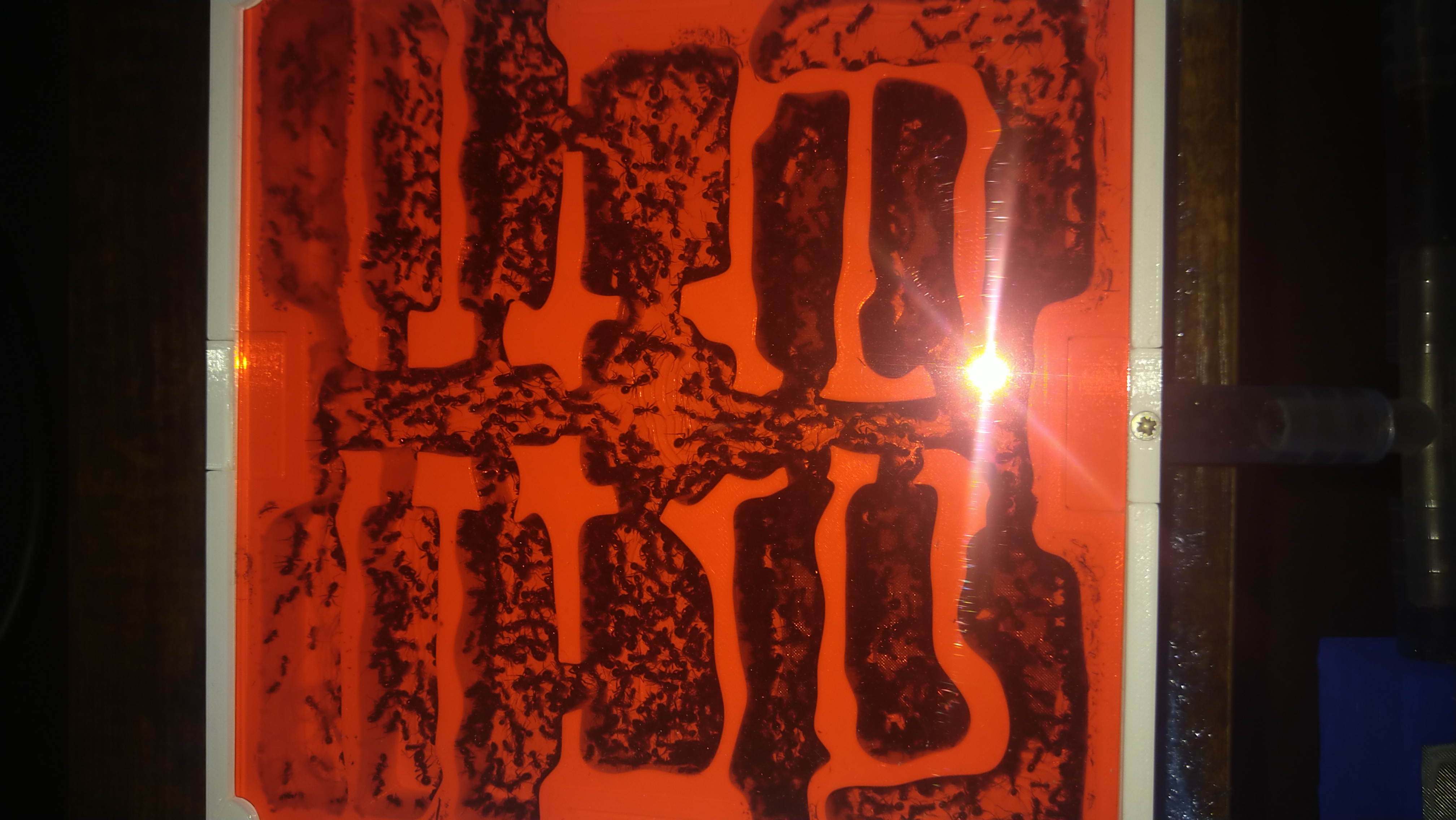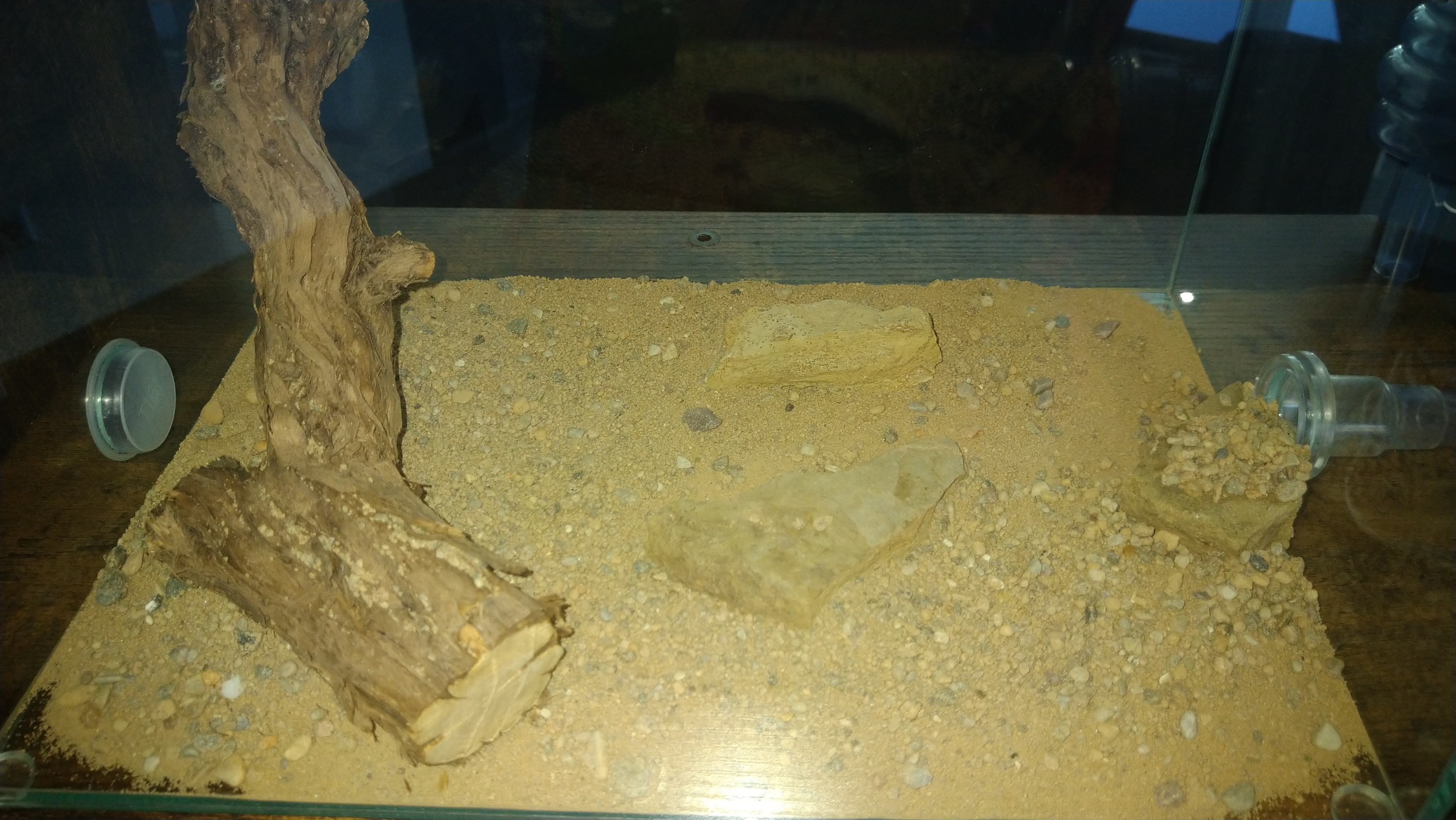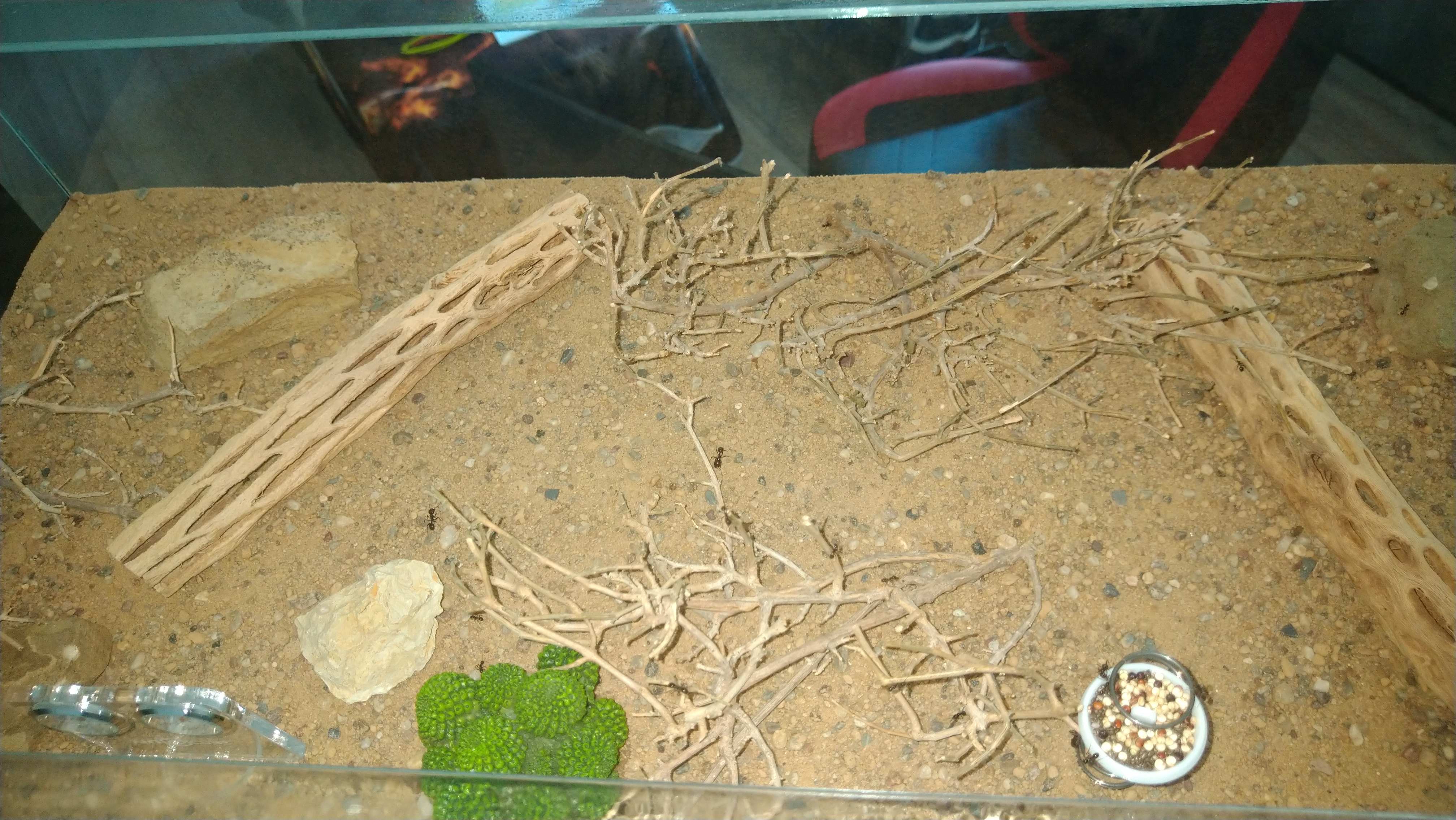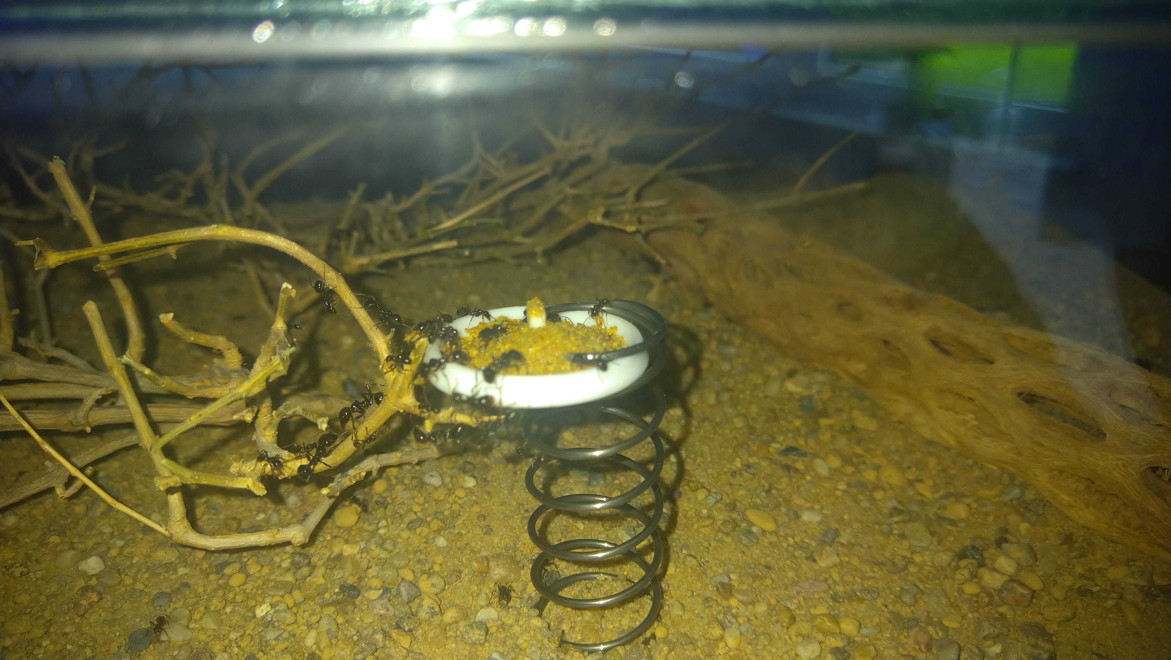 Da die eine Arena oft komplett durchquert werden muss und zur nächsten zu kommen, hat sich hier schon eine Straße gebildet. Erkennt man etwas daran das entweder der Boden Grund komplett abgetragen wurde oder sämtliche größere Steinchen aus dem Weg geräumt wurden. Zu meiner Wurzel Pflanze brauch ich wohl nichts mehr sagen. Unter dem linken Stein am Eingang sitzen immer um die 100Arbeiterinnen. Scheint eine Art Außenposten zu sein. Bei Erschütterung oder wenn ich das Wasser wieder auffülle, rücken die immer sofort aus