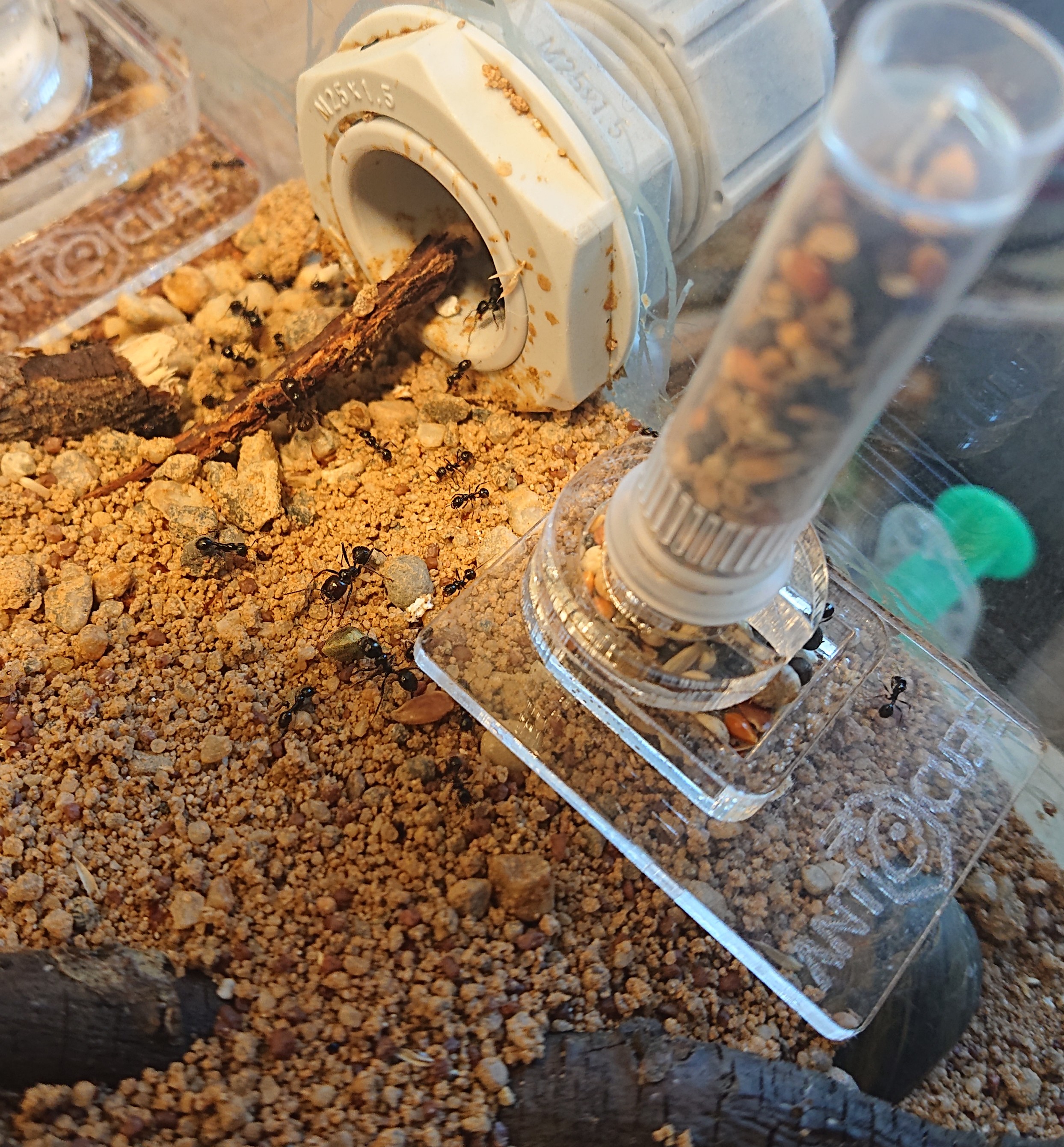Langsam merkt man auch das die Kolonie geschrumpft ist, da bei der aktuellen Masse anBrut nur wenige Arbeiterinnen neue Körner oder Proteine eintragen weil die anderen mit der Versorgung der Brut beschäftigt ist. Sie haben kürzlich fast einen ganzen Tag gebraucht um ein Futterspender vom Antstore und ein kleines Schälchen leer zu machen. Vor dem Sterben hat das keine Stunde gedauert.