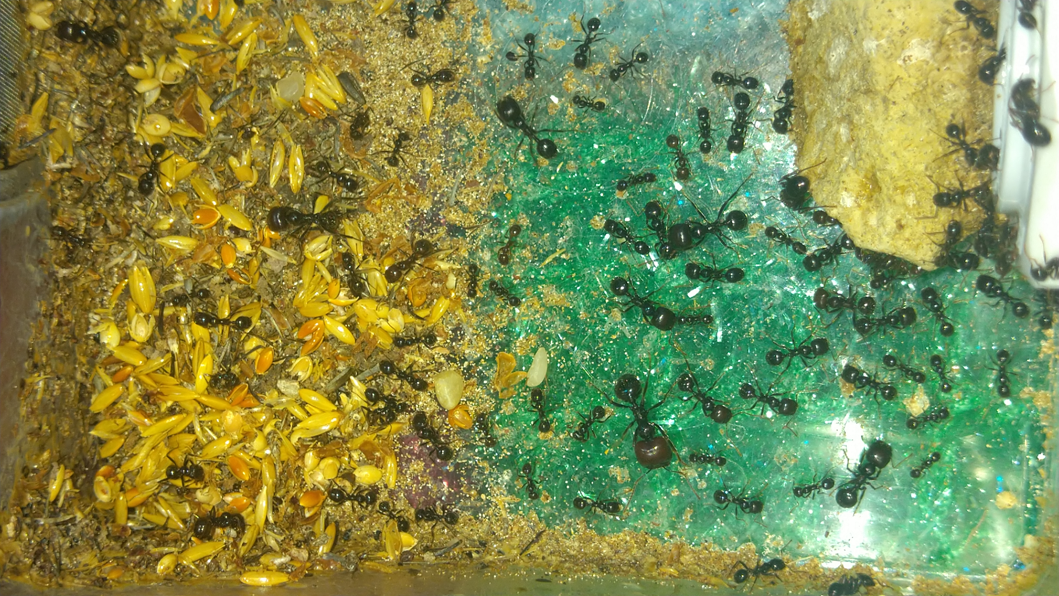 Jedenfalls komme ich zu dem Schluss das wenn man viele verschiedene Samen und Körner anbietet, die Kolonie sich immer nimmt was sie braucht und trotz 10k Koloniegröße, doch recht sparsam im Verbrauch ist. Ich hatte ja bei den Angaben der Ameisneshops von Messor orientalis "Kolonigröße größer 4.000" damit gerechent das es mehr werden, doch da ich bei wenig Insektenfutter schon bei 10.000 angelangt bin sollte jedem klar sein, mit ordentlicher Fütterung und Optimalbedingungen schafft Messor orientalis auch 15.000 locker, wenn nicht sogar 20.000. Noch immer sind keine Geschlechtstiere in Sicht, die Kolonie hat also noch lange nicht ihre maximal Größe erreicht. Bin immernoch hin und her gerissen, wie ich am besten mehr Platz anbieten könnte. Mal sehen....