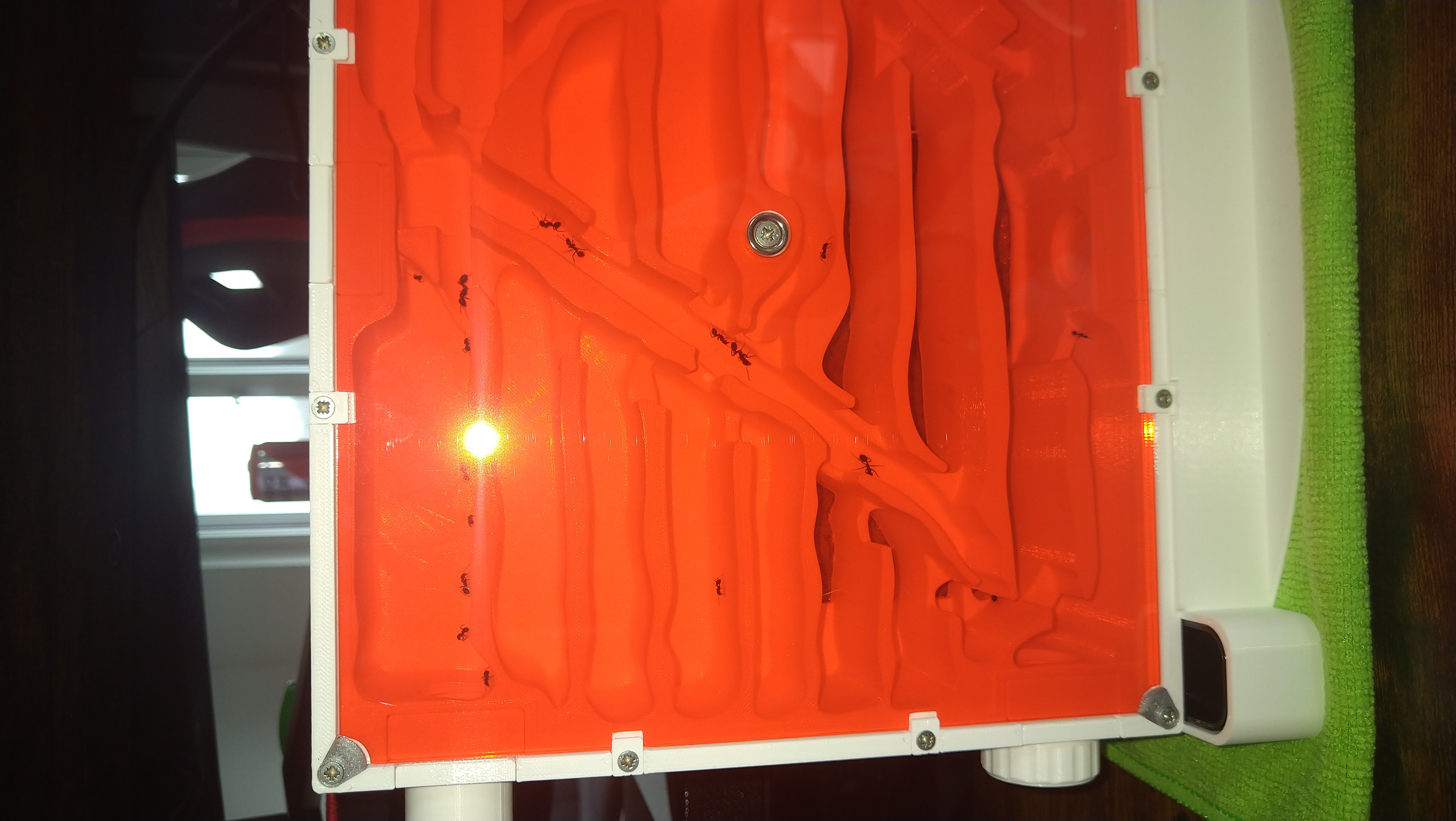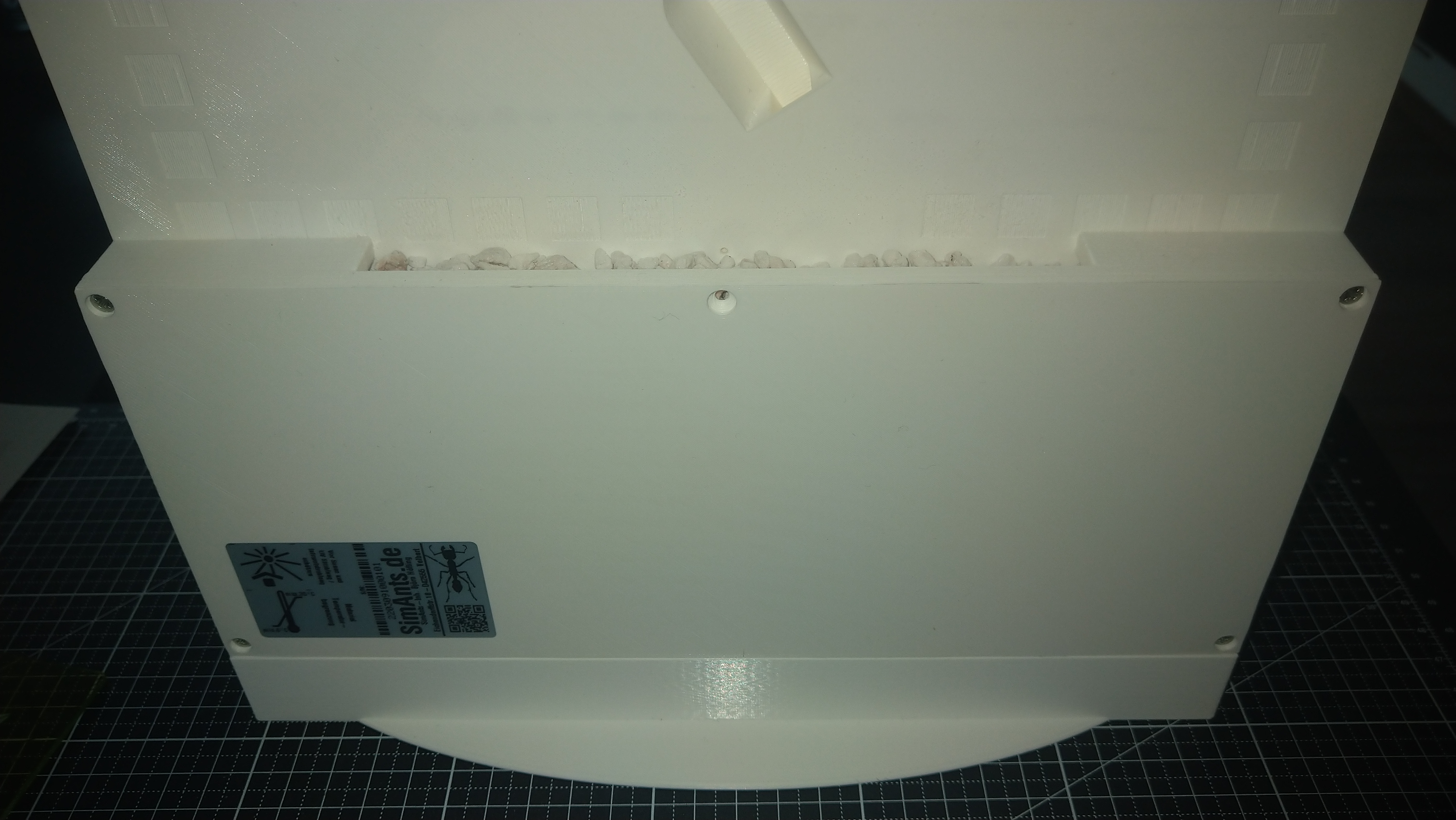 Befüllt wird das dann von vorne. Die Idee finde ich gut, ob das Ganze funktioniert wird sich noch zeigen. Allerdings ist das nicht kurz austauschbar wie bei meinen anderen Nestern. Also Perliete wechseln in meinen Augen nahezu unmöglich solange das Nest bewohnt ist (mit mehreren Schrauben im Boden verschraubt)