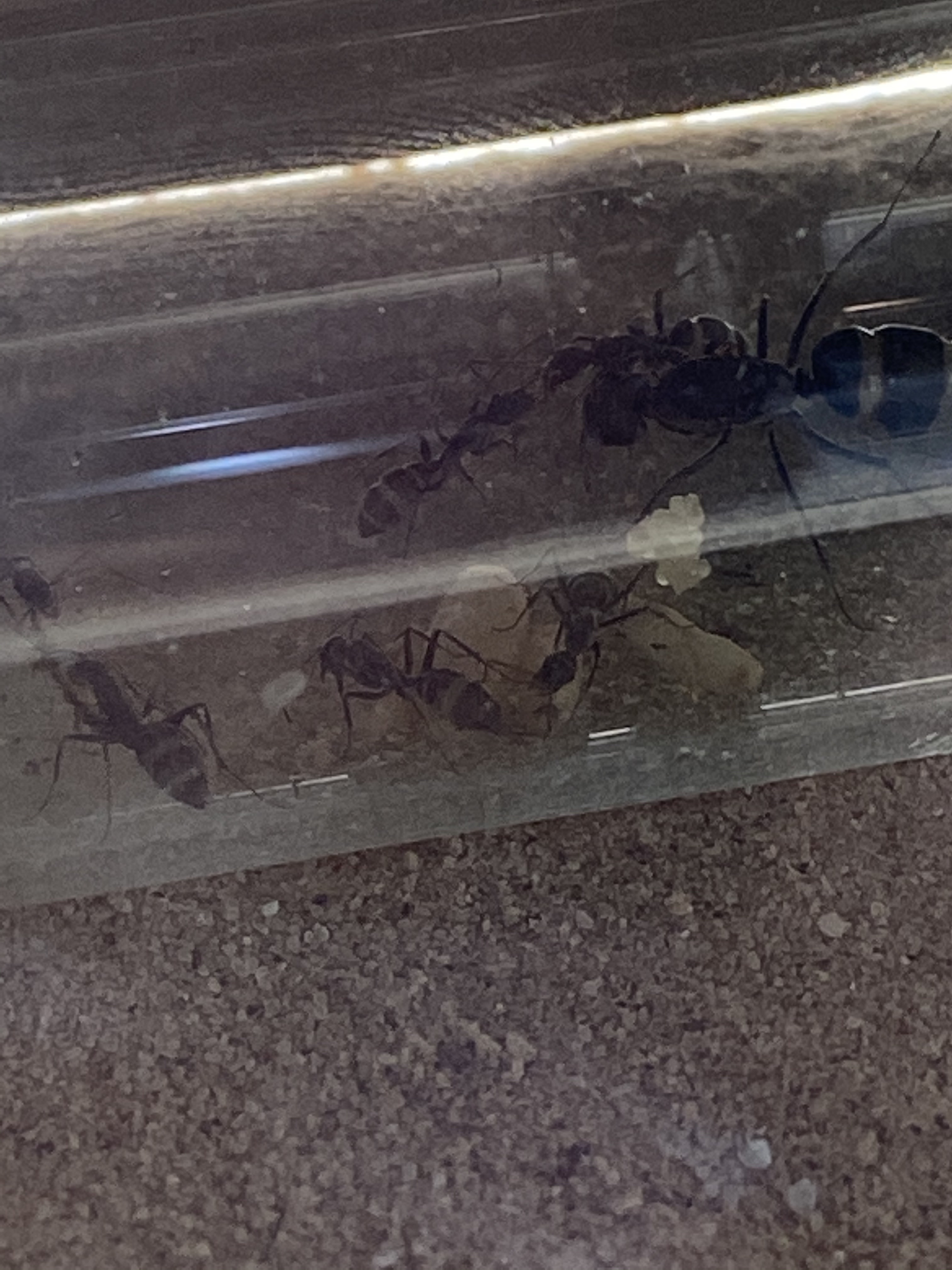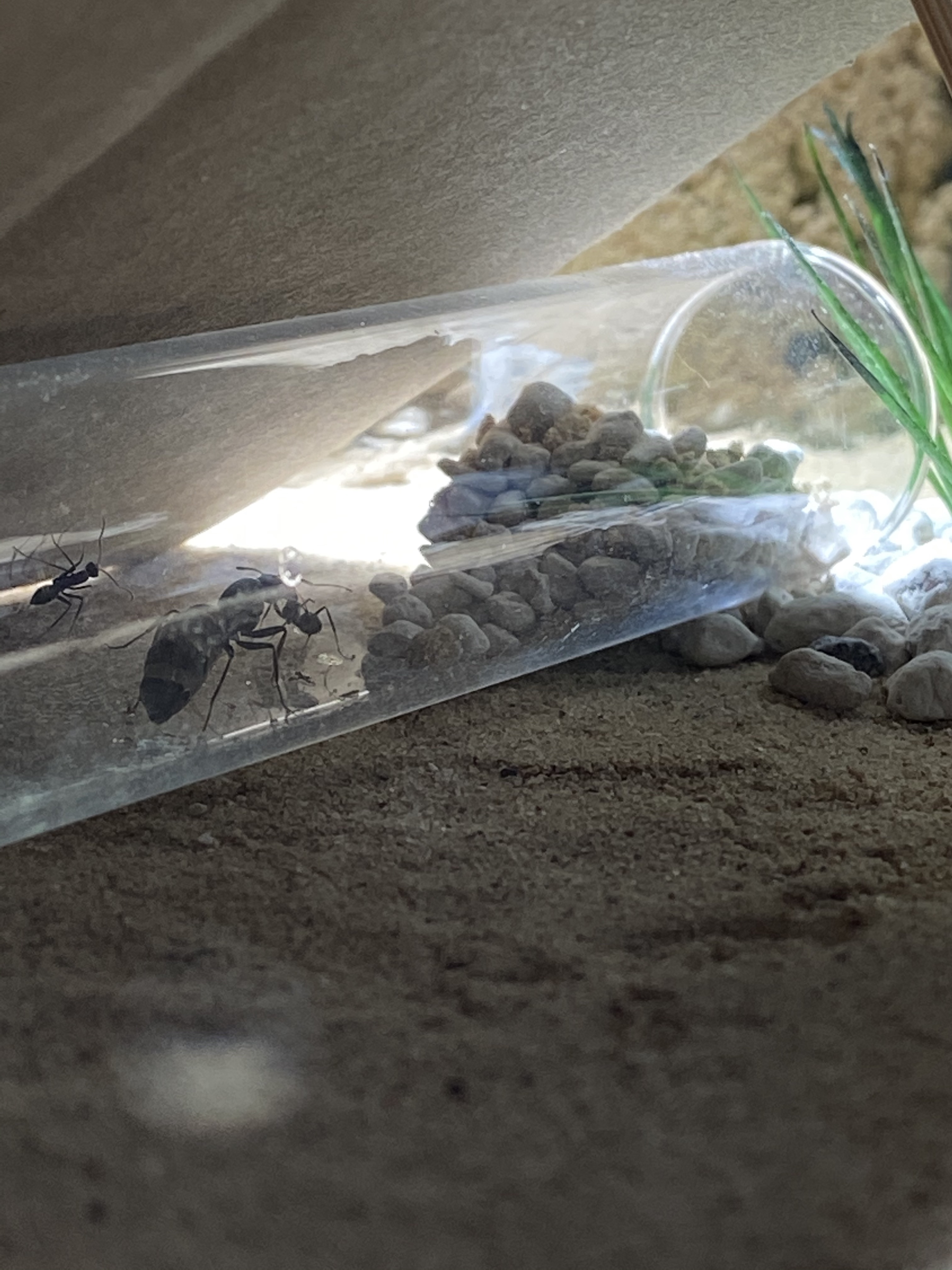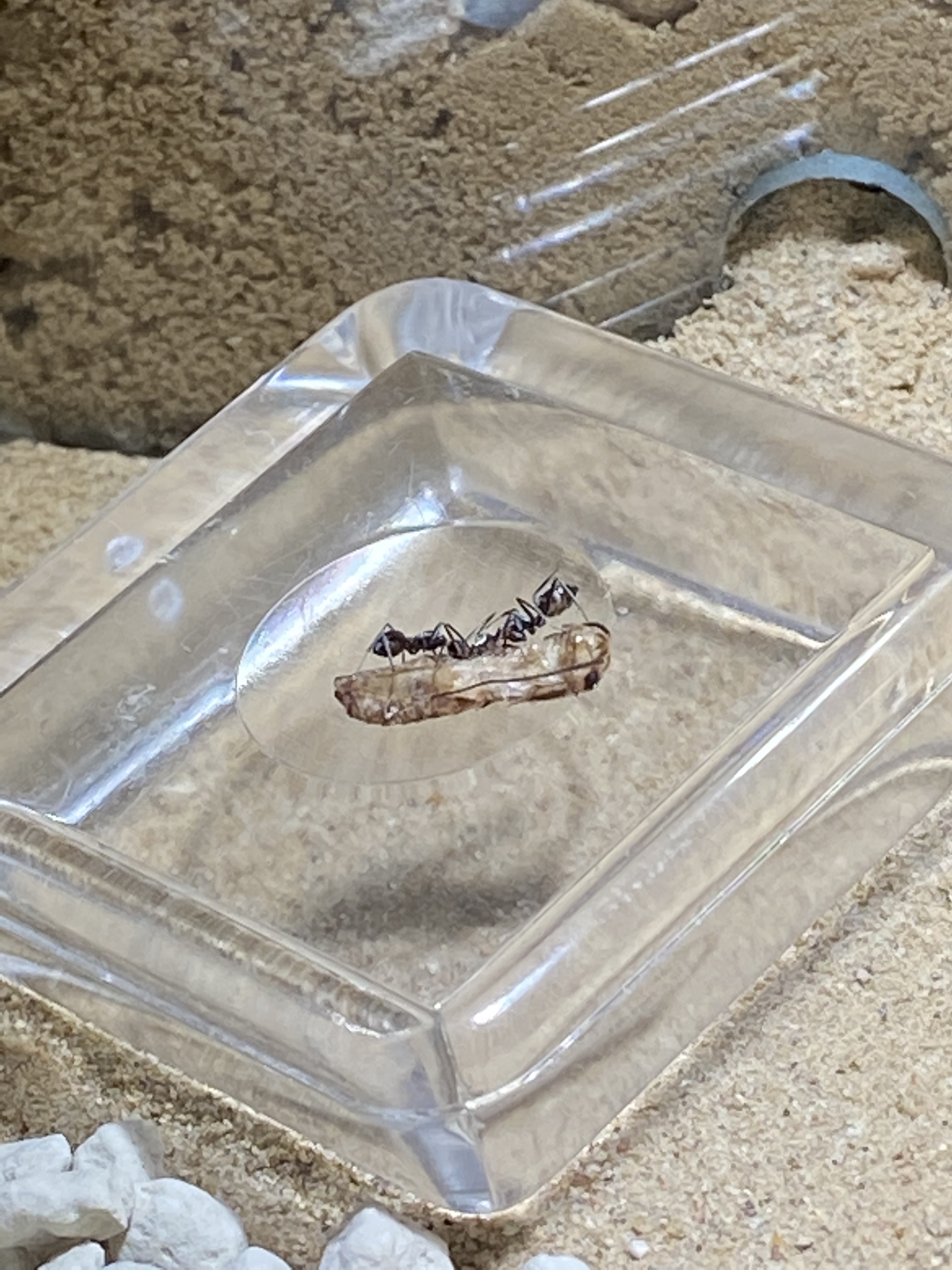 Aber, wie ihr nun eventuell erkennen könnt, ist der Platz zwischen Cube und darüber liegendem Regal sehr gering. Ständig dotze ich beim Wassertausch oder beim Füttern oben an und bringe das ganze Regal zum Wackeln. Daher habe ich nun doch eine weitere Arena angeschlossen und diese wurde auch sofort erkundet. Nahrung wurde auch entdeckt, gemeldet und von mehreren Ameisen konsumiert