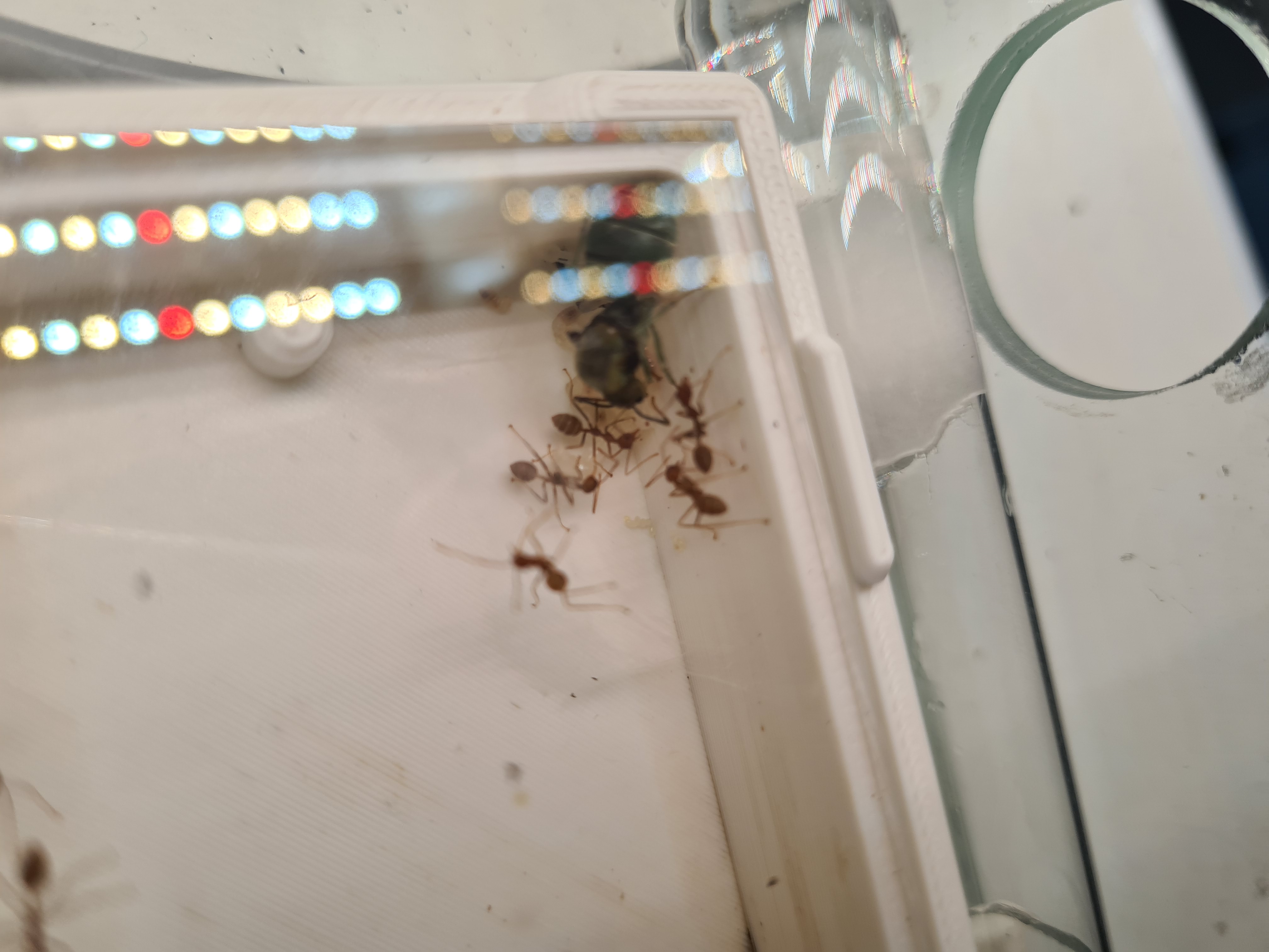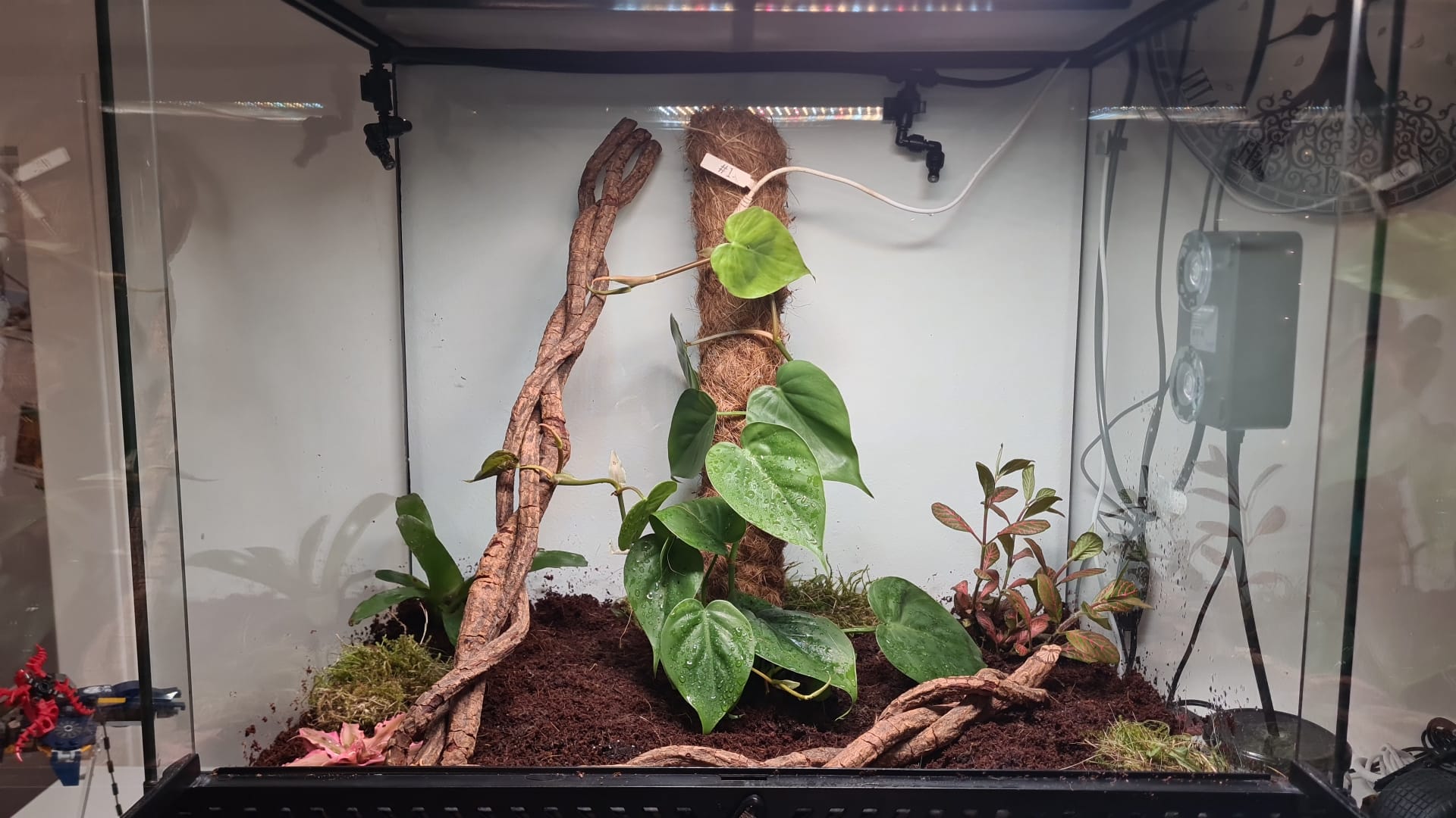 Mein Nachteil ist, wenn geheizt wird ist das Terrarium hell, d.h. wenn die Temperatur unter 26,5°C sinkt, schaltet die "intelligente" Steckdose die Heizlampen ein. An dem weißen Kabel ist der Temperaturfühler, der diese Steckdose steuert, sollte dort also eine zu hohe/ geringe Temperatur herschen wird die Lampe entsprechend geschaltet. Die Temperatur wird so durchgehend gehalten. Leider kann ich durch die Außentemperaturen nicht sagen, ob die Heizung ausreicht, denn so hat es automatisch in dem Zimmer ca. 26 bis 30°C. Ich hoffe doch dass das funktioniert. Es sind momentan zwei der 3 Fassungen belegt und beide Lampen haben 25 Watt, ich denke das sollte definitiv reichen, werde es aber beobachten.