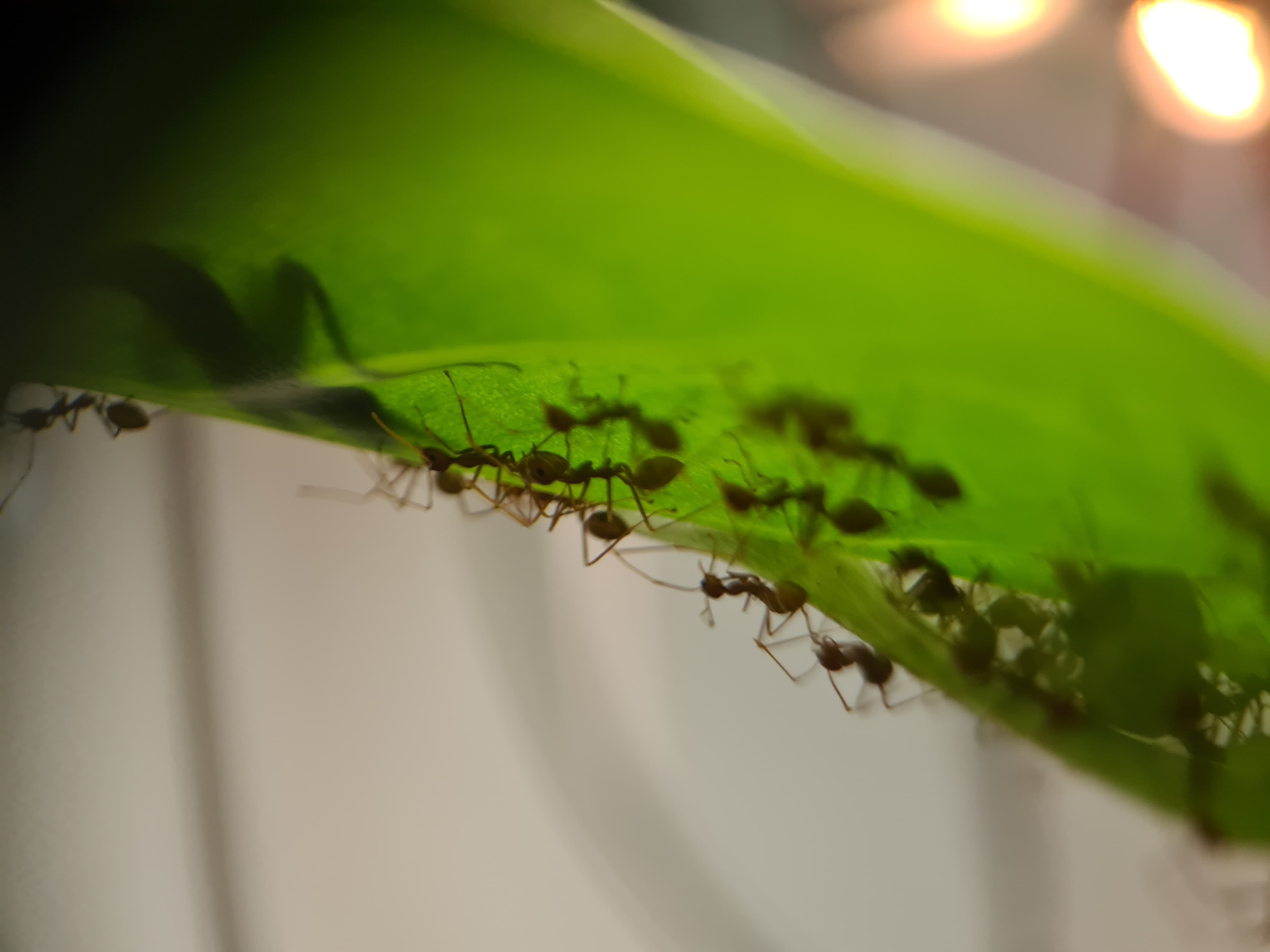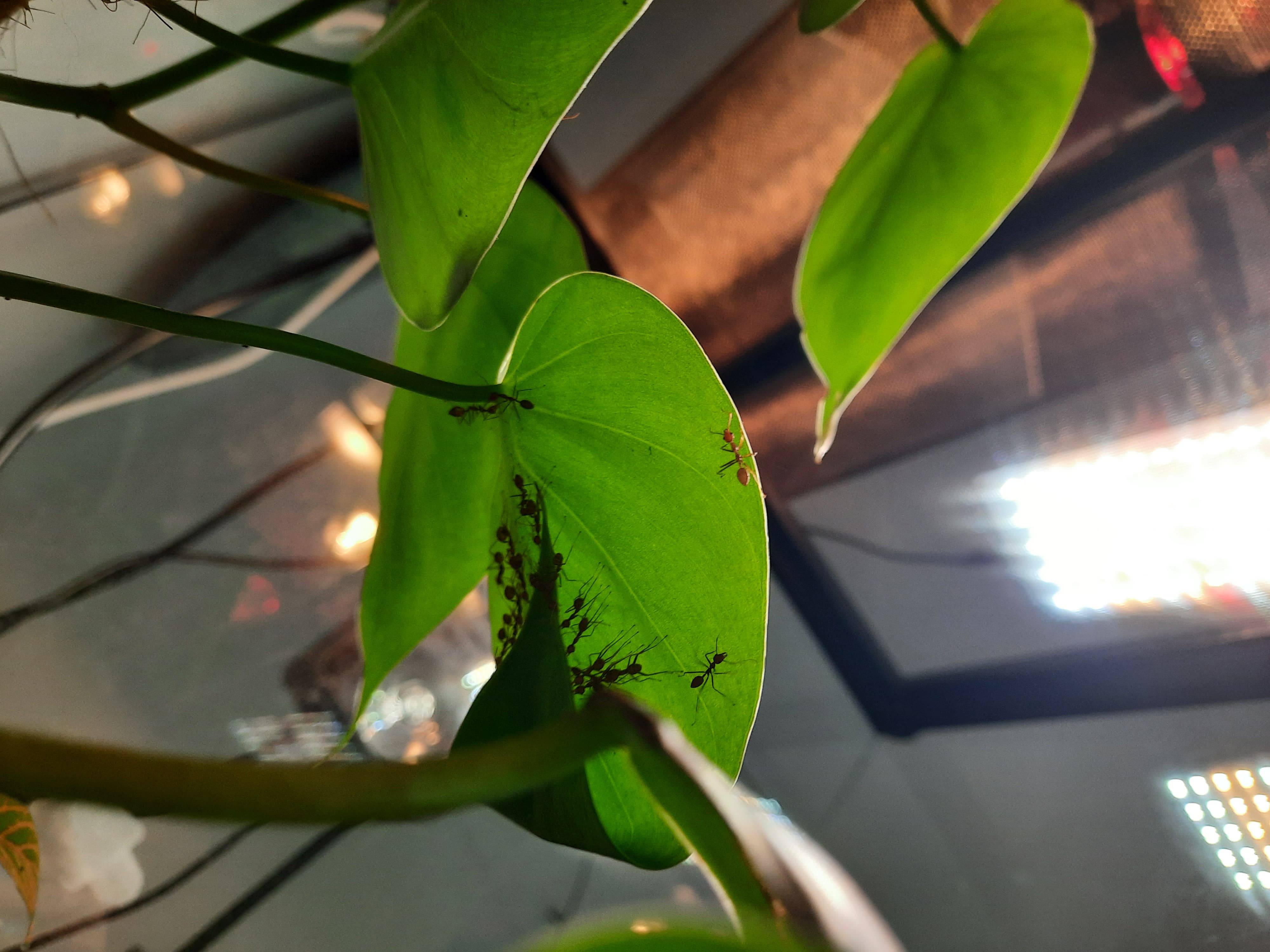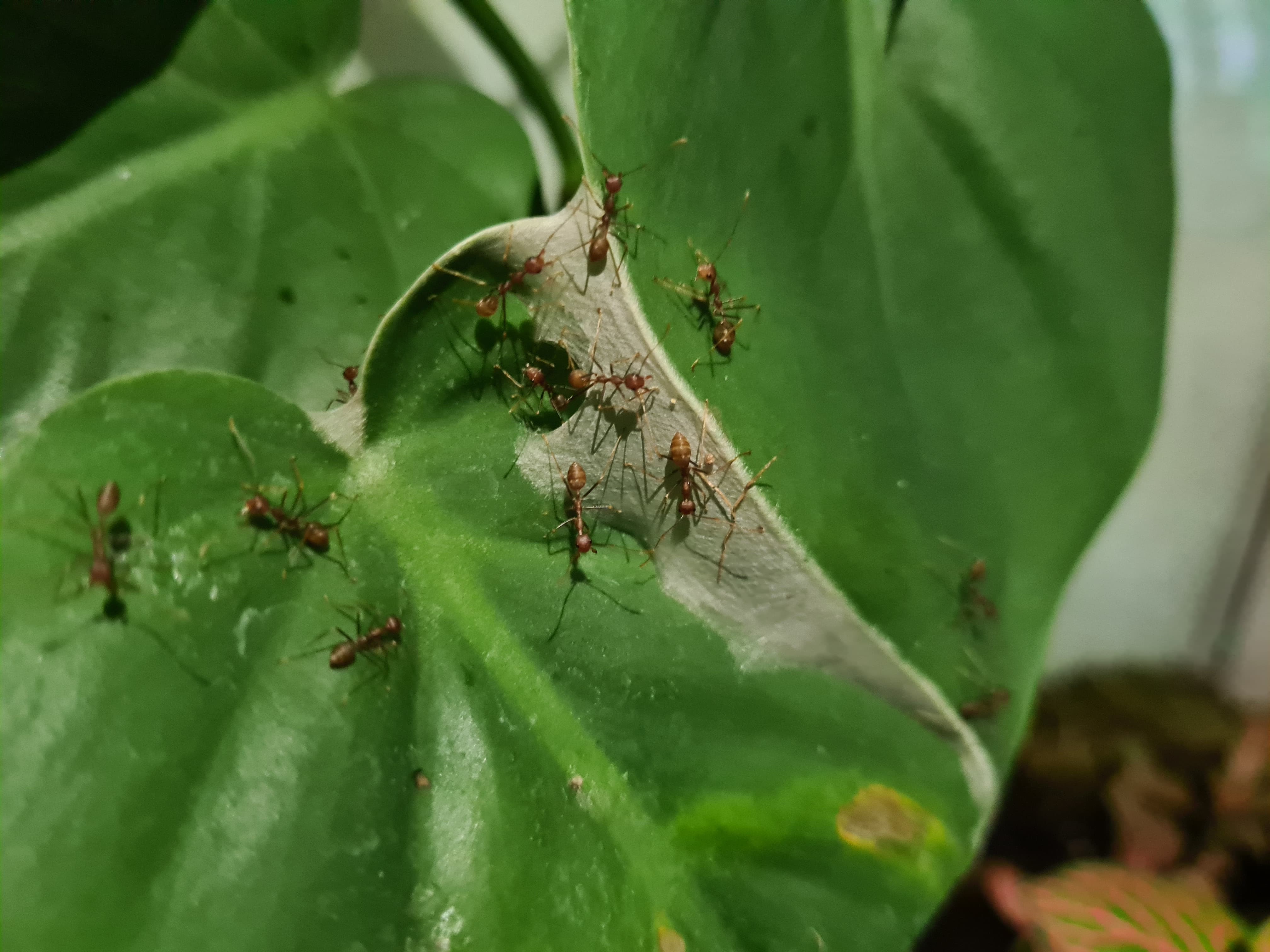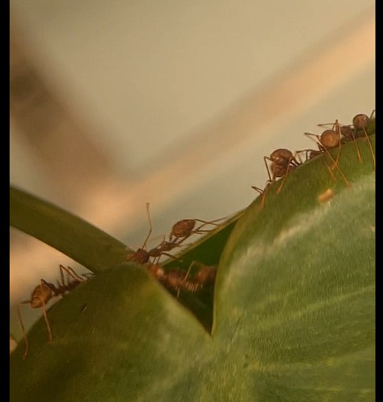 Entweder der Kolonie geht es echt gut und die brauchten mehr Platz oder ihn war in ihrem alten Nest zu kalt (was ich eigentlich nicht glaube), aber sie haben ein weiteres Blatt erobert, welches näher am Heizstrahler ist. Sie werden schon wissen, was sie tun: Ich habe keinen Nesteinblick, aber durch die Aktivität und durch den Vergleich mit der andere Kolonie mit Q1 würde ich die Arbeiterinnen auf ca. 40 schätzen (hatten beim Einsetzen in das Terrarium eine ähnliche Größe). Vllt etwas mehr. Die Q1 lebt weiterhin in einem RG und entwickelt sich echt gut! Ich werde denen bald ein größeres Reagenzglas anbieten und sobald sie umgezogen sind, ein neues zu Hause suchen. Weiter konnte ich feststellen (leider nicht beobachten), wie die Ameisen zwei Fliegen, die scheinbar beim Füttern oder Bewässern durch mich reingekommen sind, erlegt und ins Nest getragen haben. Sie können also erfolgreich jagen!