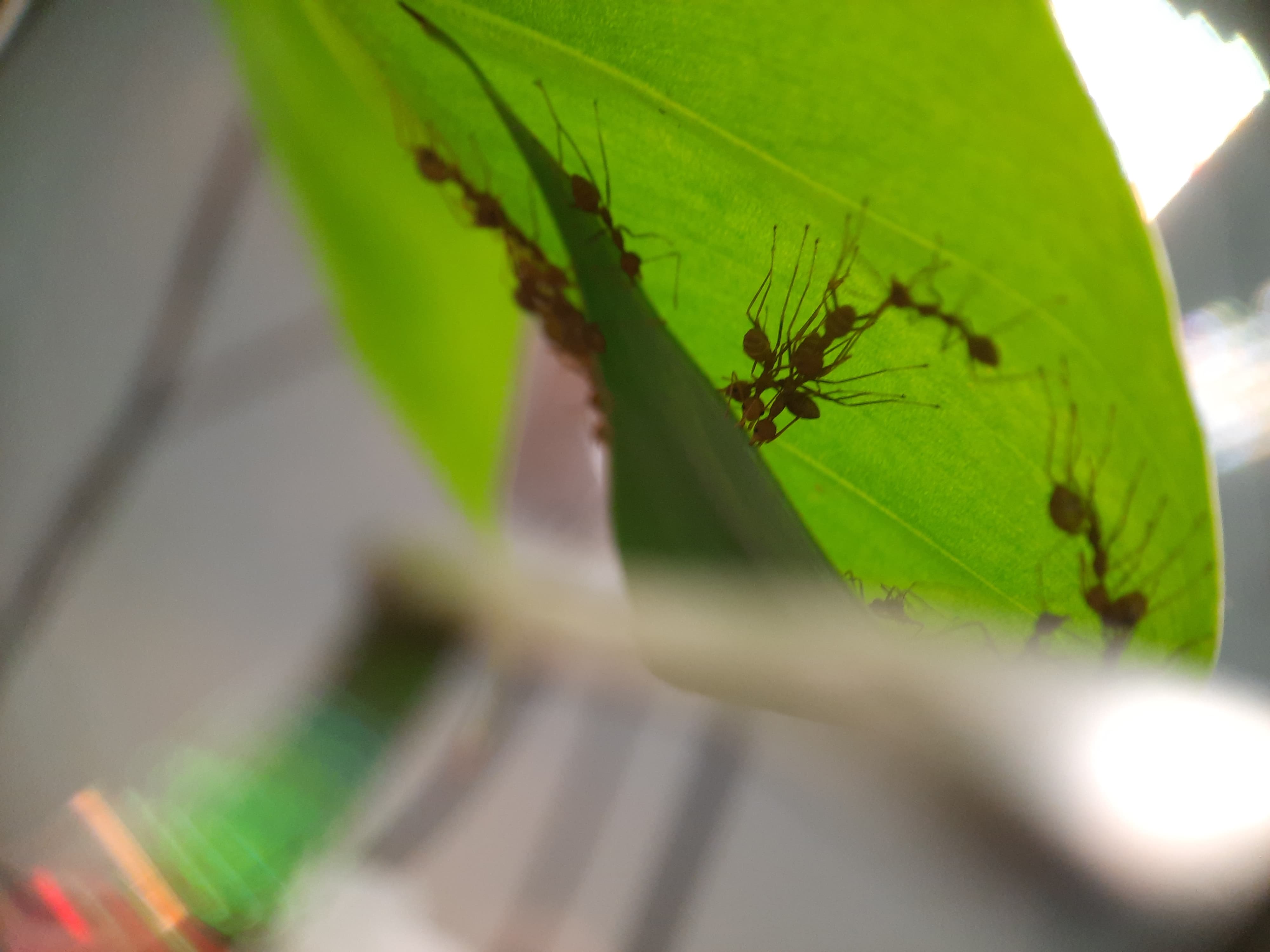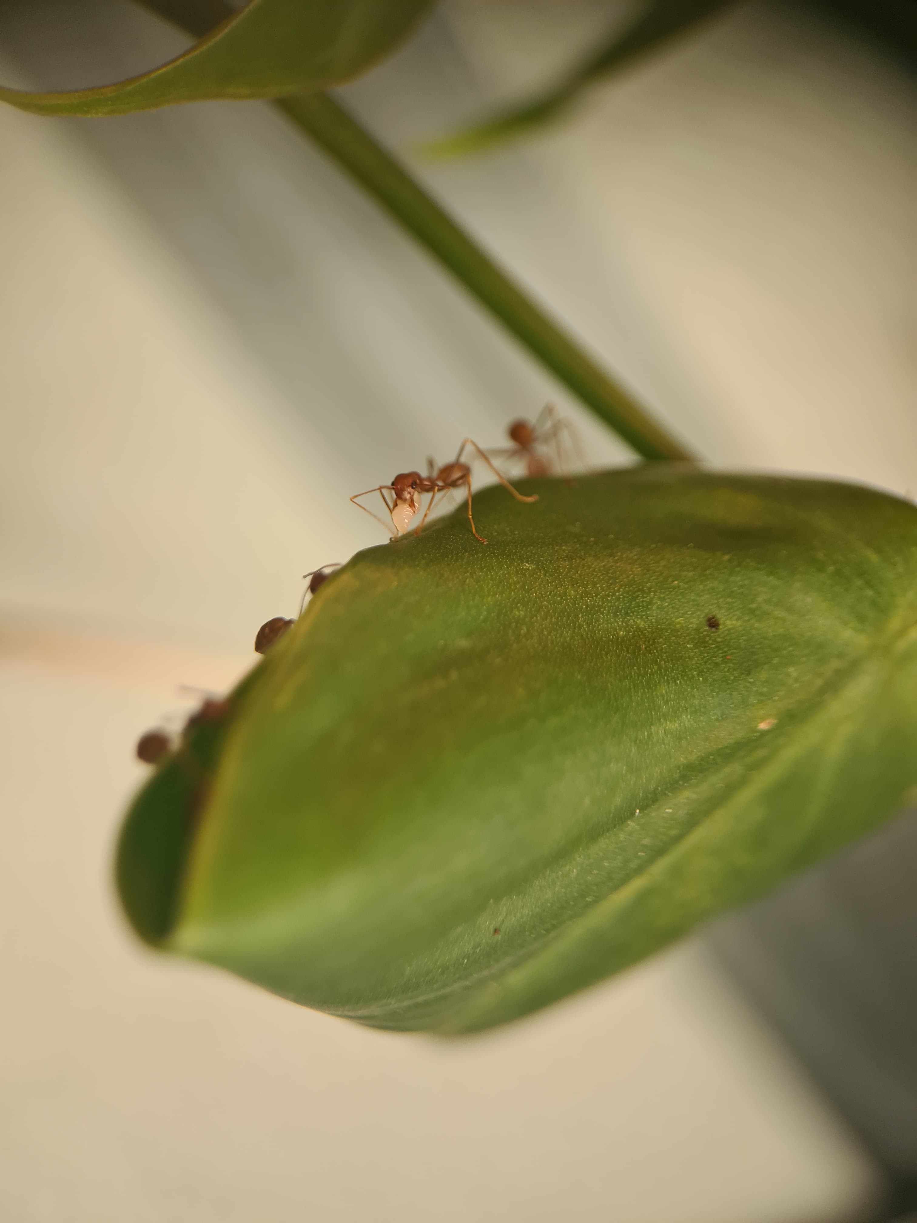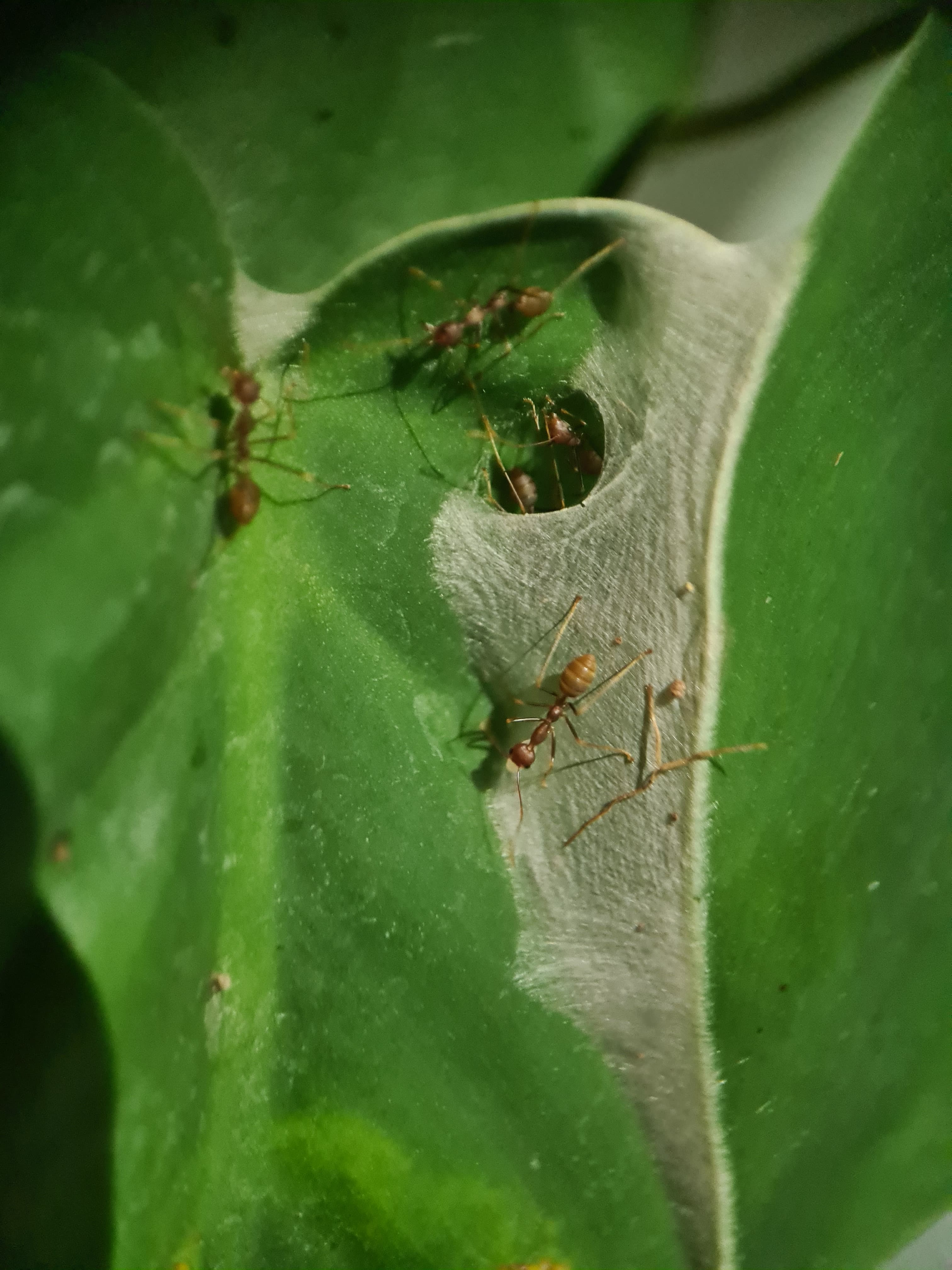 Entweder der Kolonie geht es echt gut und die brauchten mehr Platz oder ihn war in ihrem alten Nest zu kalt (was ich eigentlich nicht glaube), aber sie haben ein weiteres Blatt erobert, welches näher am Heizstrahler ist. Sie werden schon wissen, was sie tun: Ich habe keinen Nesteinblick, aber durch die Aktivität und durch den Vergleich mit der andere Kolonie mit Q1 würde ich die Arbeiterinnen auf ca. 40 schätzen (hatten beim Einsetzen in das Terrarium eine ähnliche Größe). Vllt etwas mehr. Die Q1 lebt weiterhin in einem RG und entwickelt sich echt gut! Ich werde denen bald ein größeres Reagenzglas anbieten und sobald sie umgezogen sind, ein neues zu Hause suchen. Weiter konnte ich feststellen (leider nicht beobachten), wie die Ameisen zwei Fliegen, die scheinbar beim Füttern oder Bewässern durch mich reingekommen sind, erlegt und ins Nest getragen haben. Sie können also erfolgreich jagen!