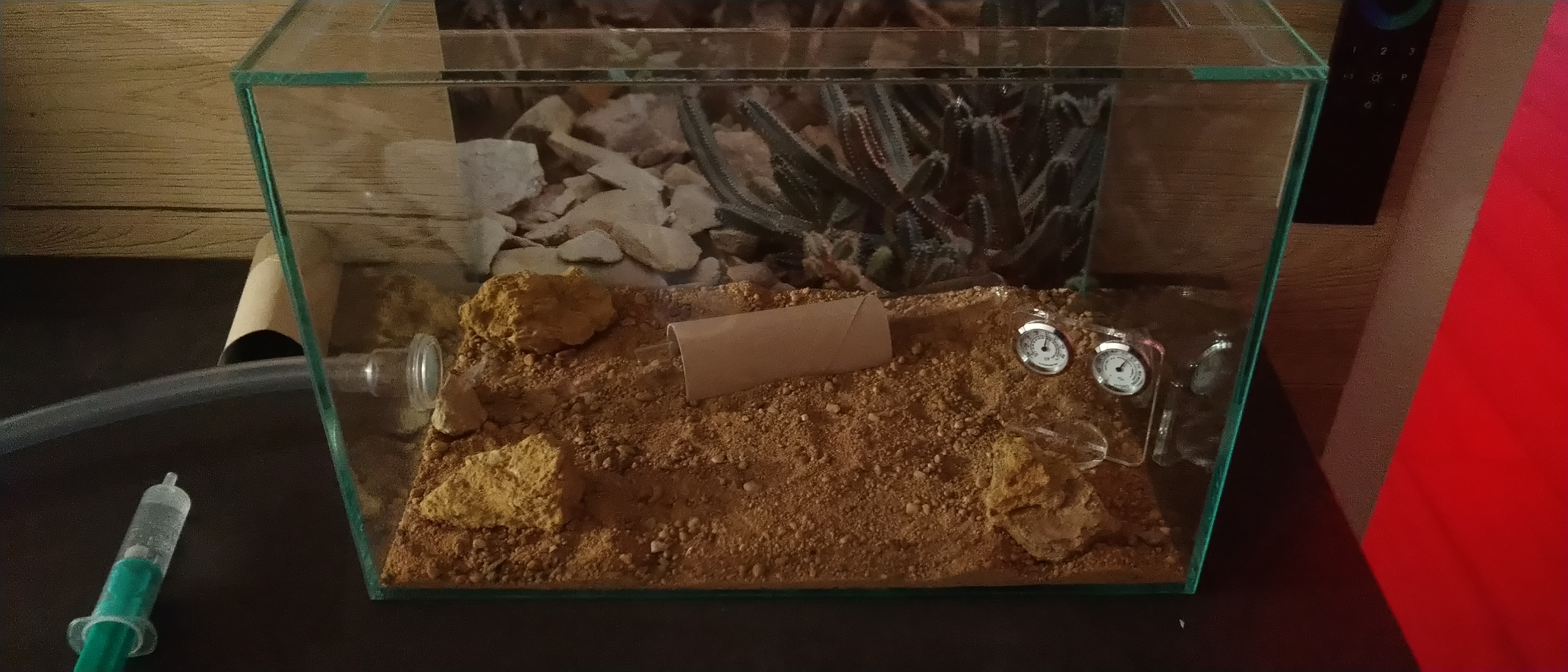 Unten mal ein Bild wie das jetzt aussieht. Jetzt kann ich kontrolliert 25C in der Arena halten somit auch im Reagenzglas. Plötzlich ist auch Leben zu sehen. Es wird durch die Arena geflitzt(Abends natürlich) und erkundet. Beim füttern keine Erschütterungen mehr weil einfach alles schwerer gebaut ist.