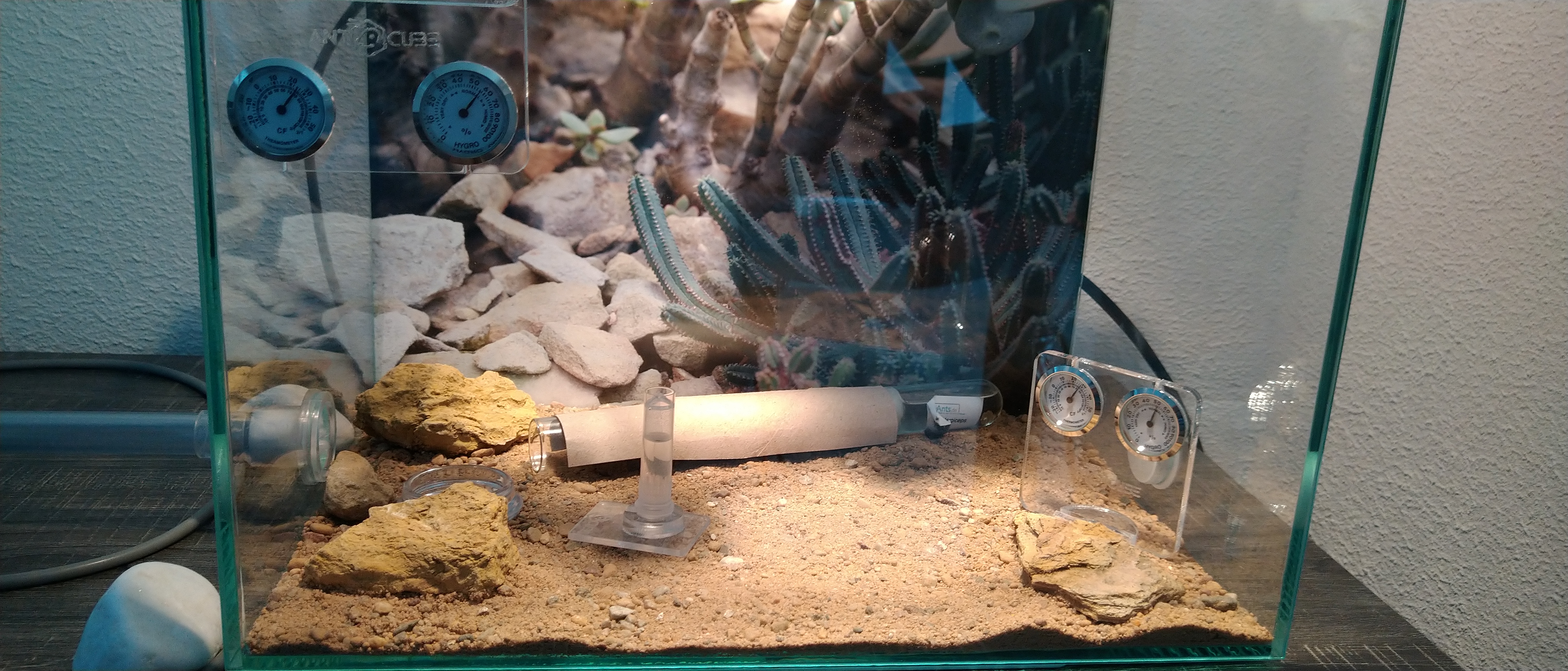Die große Tränke aus dem starterset ist in meine Augen hier fehlangebracht. Nach 10min herrscht in der kleinen Arena sofort eine Luftfeuchtigkeit von 95%. Da das Wasser aber ohnehin immer vom Gipspunkt im Acryl Nest geholt wird, kommt die Tränke erst wieder in einer großen Arena zum Einsatz (fange ich heute mal an einzurichten und mit der Temperatur usw. zu experimentieren) .