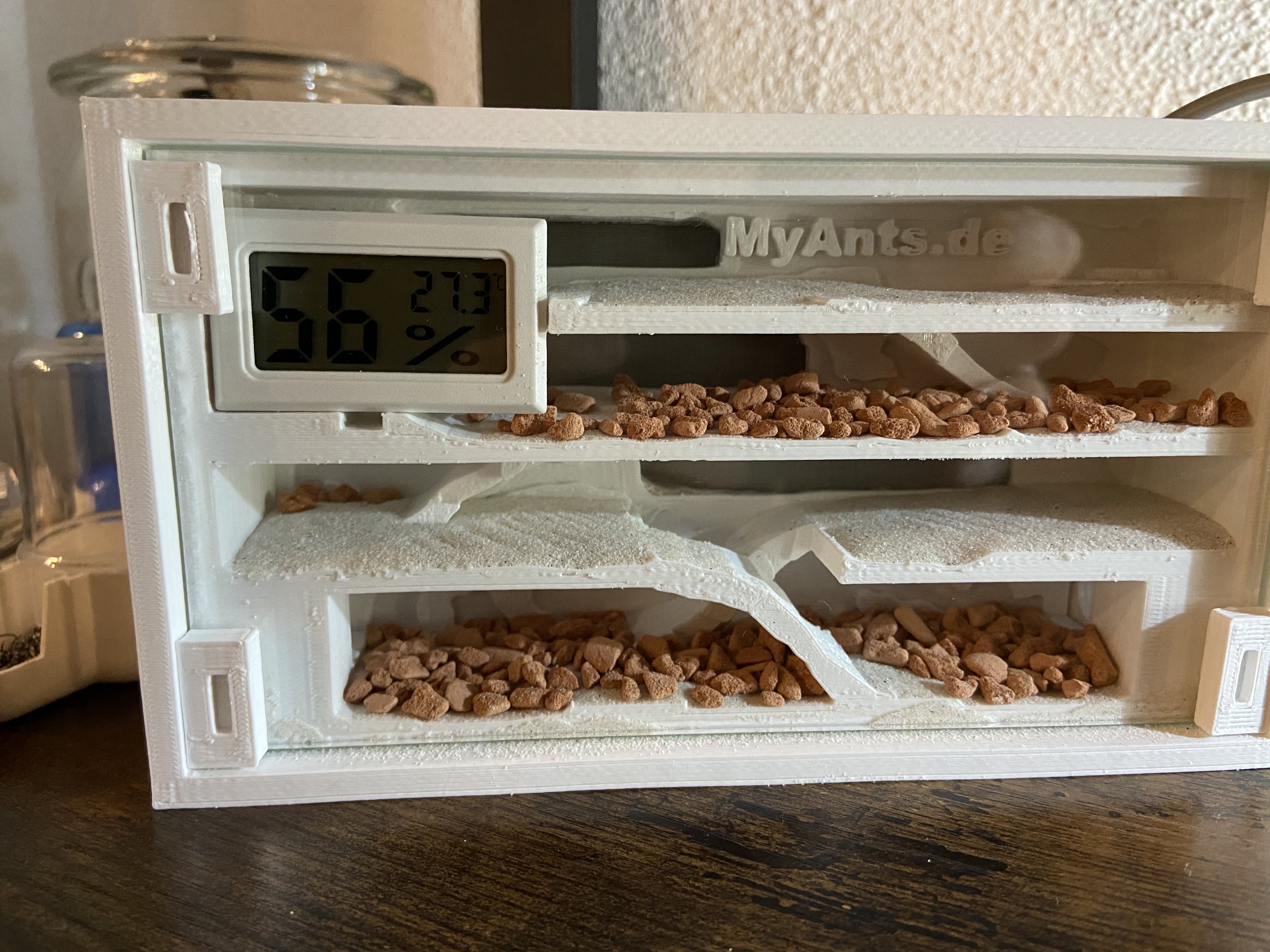 Ich wollte meinen Kleinen etwas Gutes anbieten, nämlich ein eigenes Nest indem ich die Temperatur und Luftfeuchtigkeit noch besser regulieren kann und es ihnen dort möglichst bequem mache! Ich habe mich für das kleine von MyAnts entschieden. Hierzu vielleicht vorab ein paar Fragen für die Kenner: Wenn ich die Watte hintendran befeuchte, bekomme ich meistens eine hohe Luftfeuchtigkeit, aber nur sehr kurz. Dann sinkt sie wieder auf ca 40% ab. Ist das normal, dass ich das täglich befeuchten muss oder mach ich etwas falsch/nicht ganz richtig?