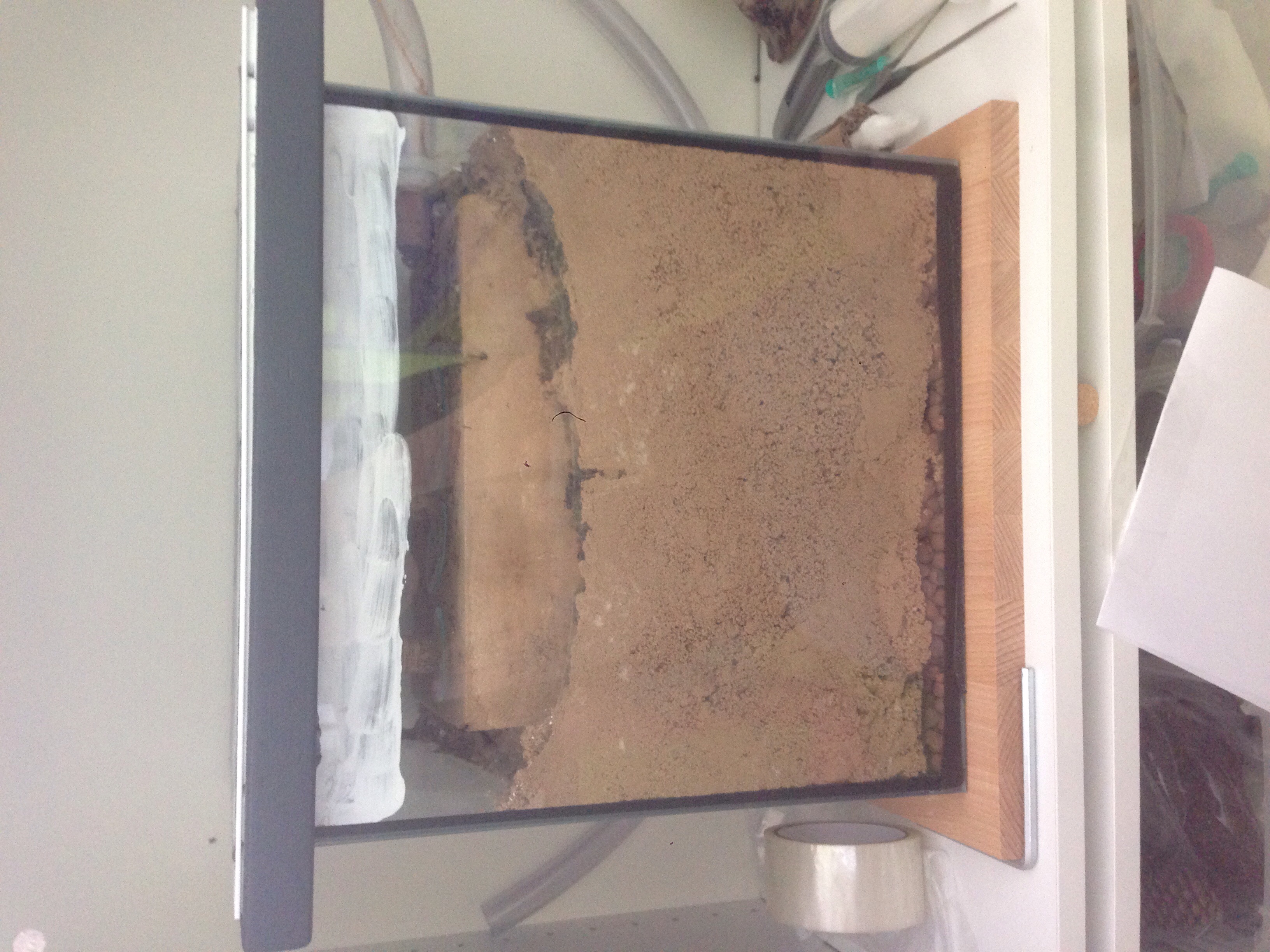Unten befindet sich eine dĂŒnne Schicht Tongranulat auf der in der Mitte ein Ytong steht der mit Lehm eingeschmiert wurde. In dem Ytong sind 2 Löcher, das erste geht bis fast ganz unten und das andere nur bis zur hĂ€lte und beide dienen zur befeuchtung. Der Ytong wurde so angepasst das an jeder Seite ca 3,5cm Platz sind. Dieser Zwischenraum wurde mit einem Sandlehmgemisch (VerhĂ€ltnis 4/1) aufgefĂŒllt damit die Ameisen dort ihr Kammern und GĂ€nge bauen können. Ich habe folgendes Problem die Ameisen fangen nicht an zu buddeln sondern sitzen oben auf dem Sandlehmgemisch. Kann mir jemand sagen woran das liegt?