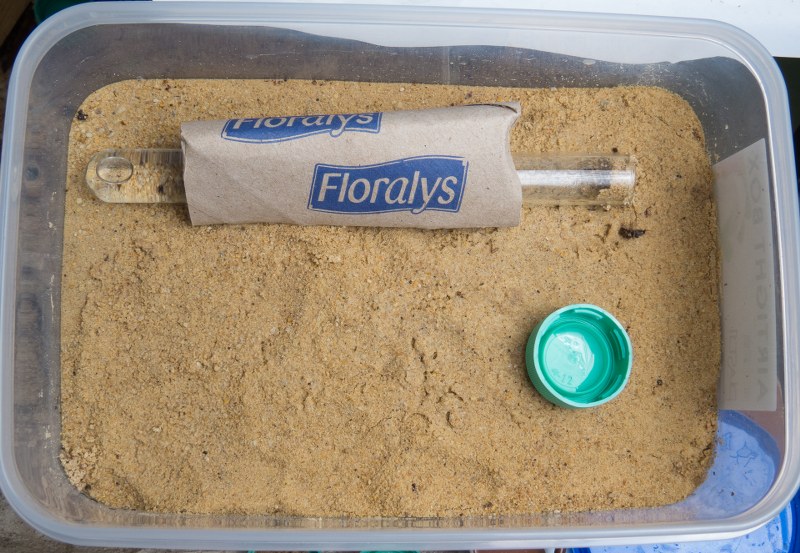 Plastik Box, Heimchen Box, Ferrero Schachtel ... entweder in etwas reinlegen oder ein Loch bohren wo das RG gerade so reinpasst und etwas abdichten.