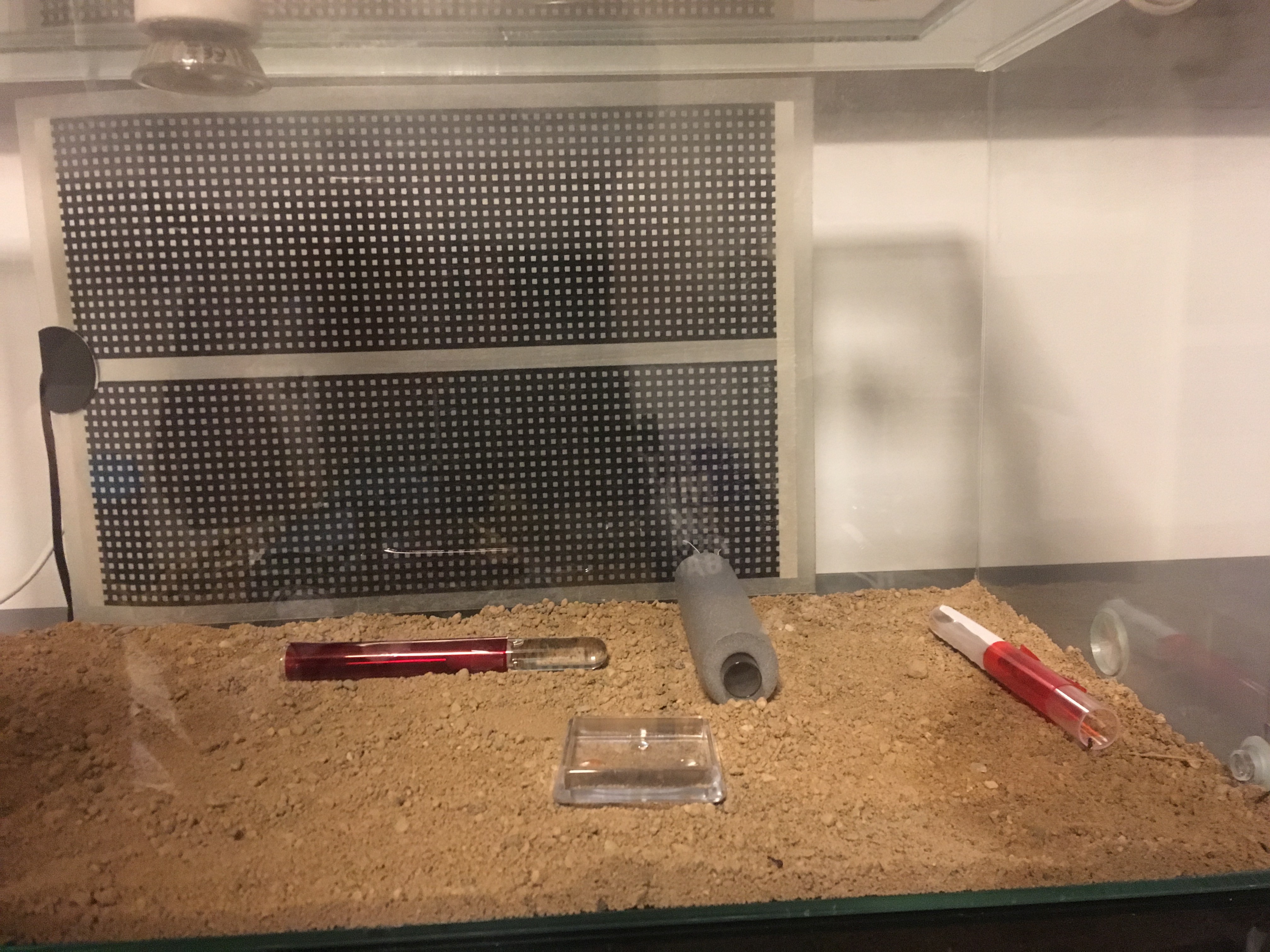Diese habe ich mit dem RG in die Arena 60x30cm gesetzt. Dazu verwende ich eine Heizmatte mit 20Watt, an die Rückwand geklebt. Ich habe das Gefühl, dass die Heizmatte nicht richtig heizt. Die obere Hälfte ist ungefähr so warm, wie ein warmer Händedruck, wenn man die hand auf die Heizmatte legt. Hingegen spürt man bei der unteren Hälfte der Heizmatte fast gar keine Wärmeabgabe.