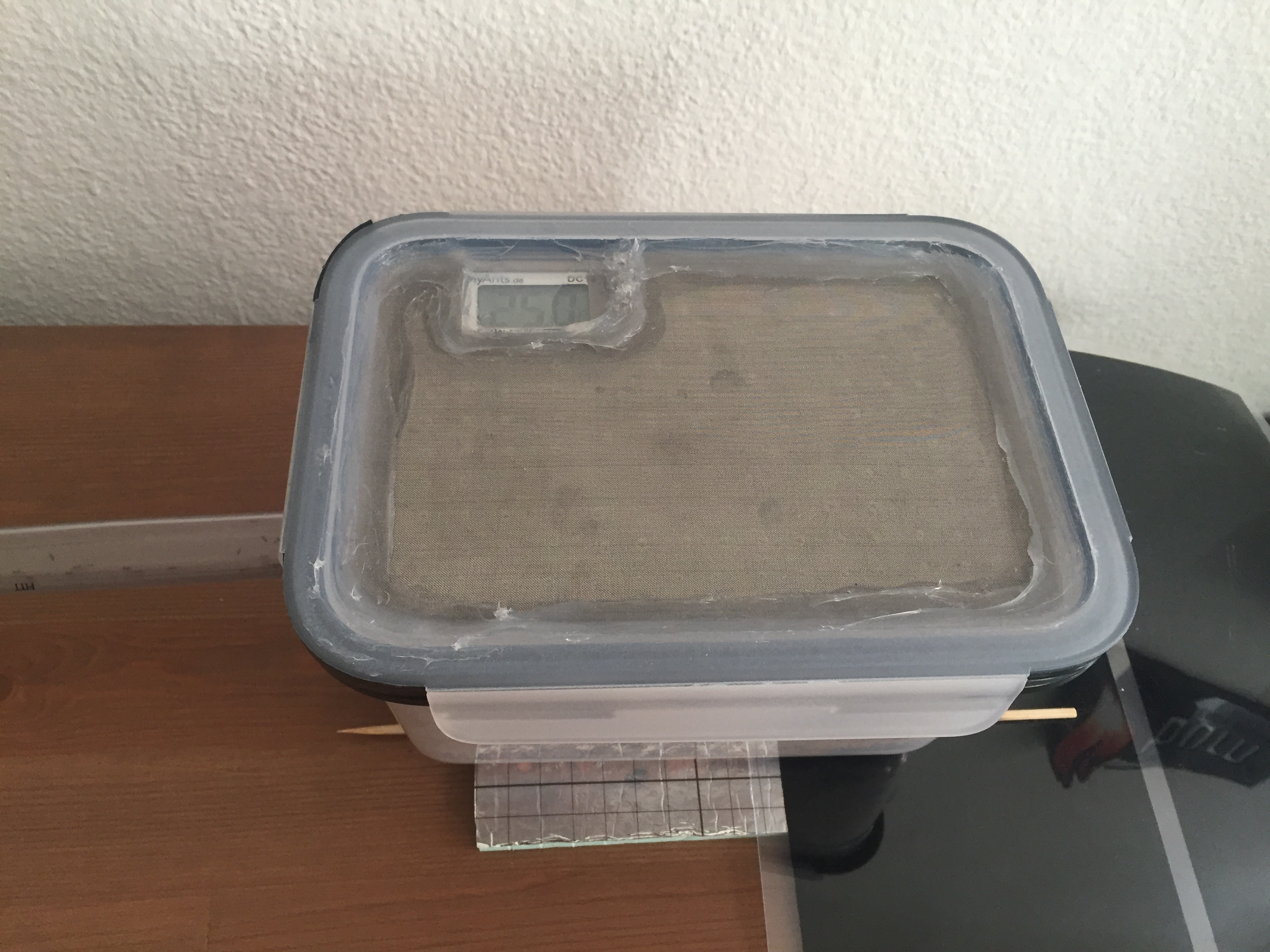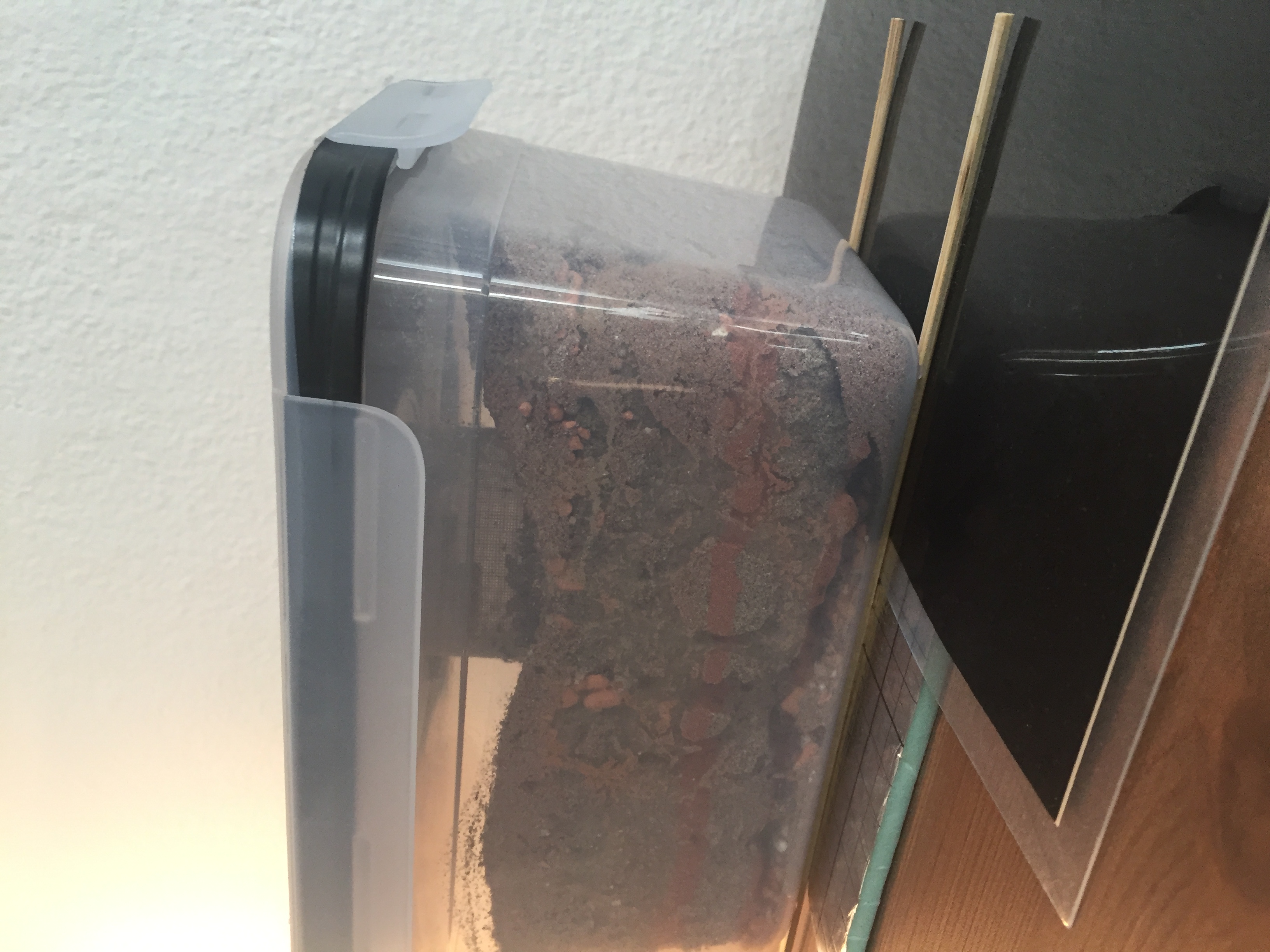 Du kannst optional noch eine Belüftung unten seitlich machen - ich hatte meine P. megacephala ja auch in Frischhalteboxen und nach einer Weile hatte ich das Gefühl, dass die Nestbelüftung im Erdnest unzureichend ist bzw. das sich unten was ansammelt.