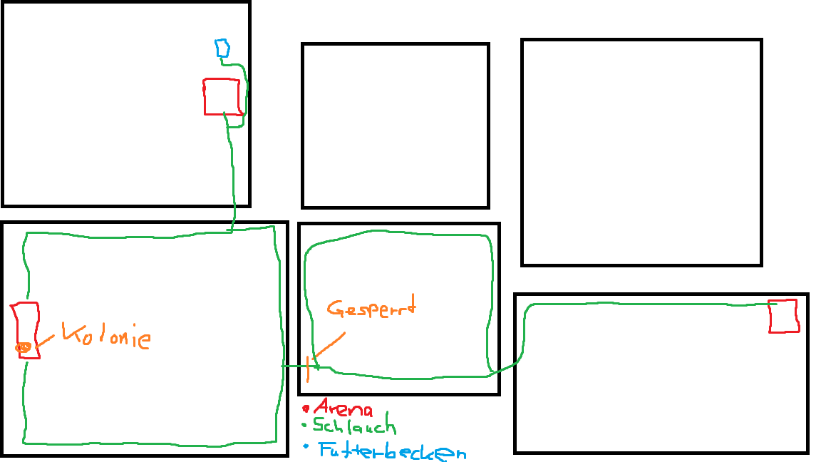 3. um sie nicht voll zu überfordern habe ich bisher noch die hälfte wie in der Skizze geschlossen zu halten. Brauche ich das? ich meine Theoretisch ist es ja selbst mit 200 Meter verlegten Schlauch immernoch eine Miniaturwelt für sie...selbst für Ameisen