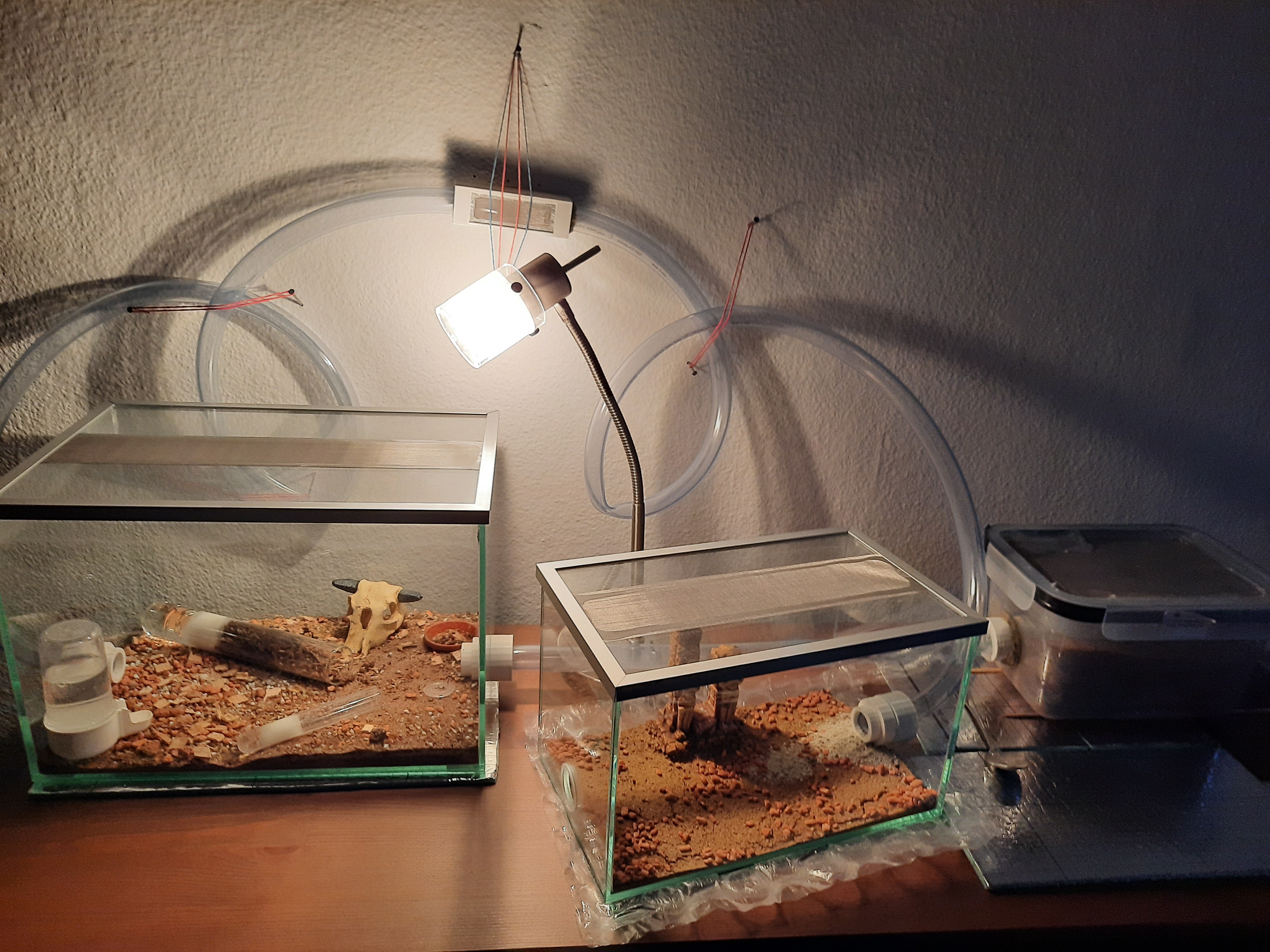 Hier der Aufbau mit 2 Arenen und dem Nest ganz rechts. In der großen Arena liegt das (riesige) Reagenzglas mit der neuen Kolonie