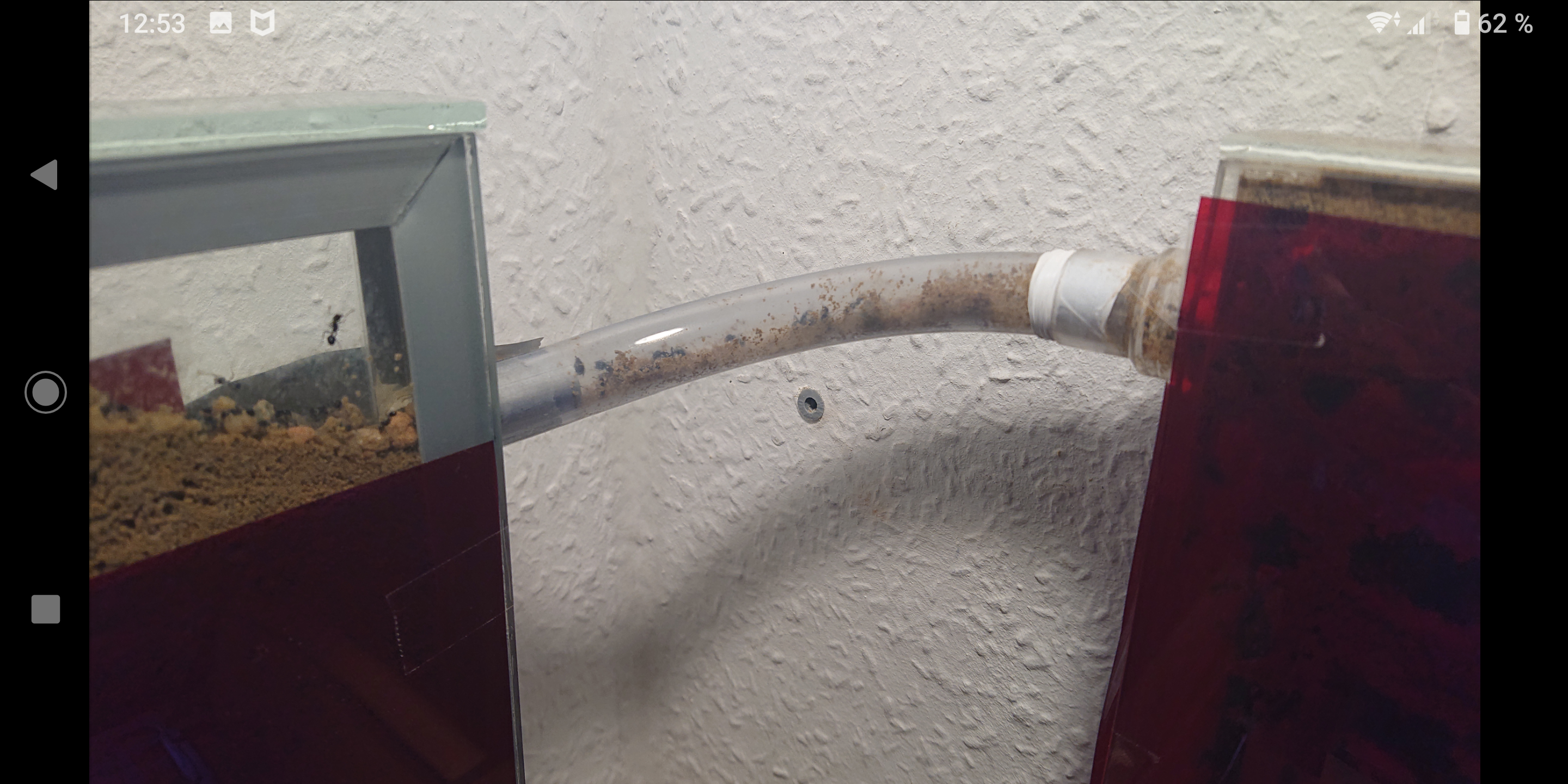 Die Ameisen haben es nicht geschafft sich selber mit Wasser zu versorgen. Deshalb haben sie den Schlauch zur Anfangs zu feuchten zweiten Farm immer wieder auf gemacht und wenn die Werte passten, wieder zu gemacht. Sie haben regelrecht alles was nass ist von unten nach oben geholt.