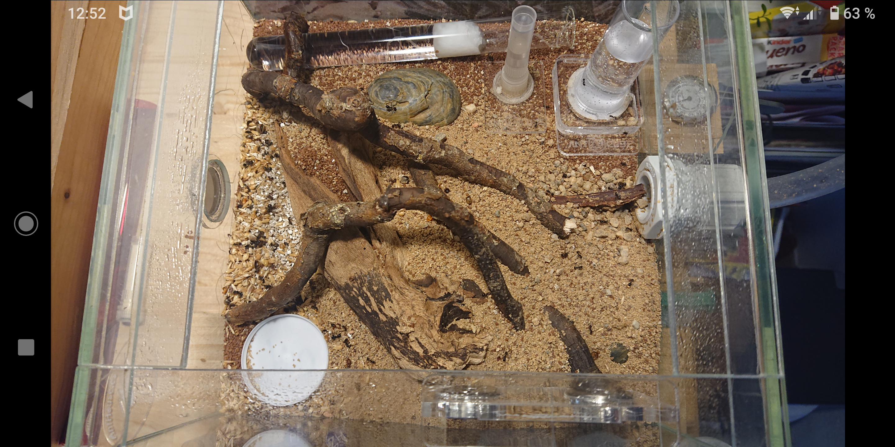 Dieser Vorgang wiederholte sich mehrmals. Also Schlauch wieder frei gebuddelt, im der neuen Farm gearbeitet und teilweise Seramis raus geholt und dann wieder zu gebuddelt. Ich habe mir Gedanken gemacht warum das so ist und habe das neue Nest wieder ab gemacht und die Luftfeuchte kontrolliert. 90% bei geschlossenem Deckel... Daraufhin hab ich den Deckel abgelassen und die Heizmatte aufgedreht damit es trocknet. Nachdem ich zwischen 60% und 70% war habe ich es wieder angeschlossen. Kurz darauf waren sie wieder da drin und das bis jetzt.
