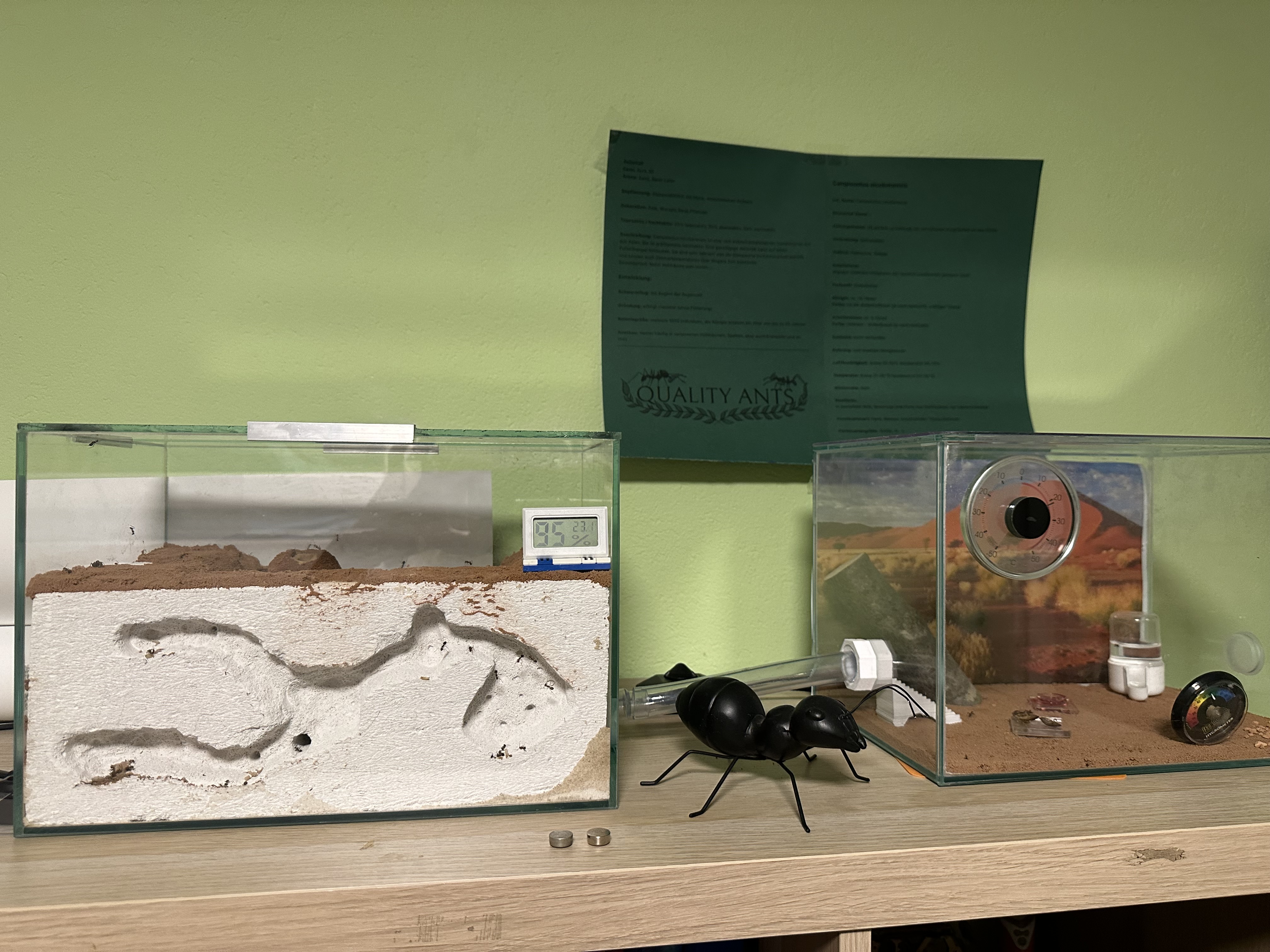 Ich habe vor ca. drei Monaten zwei Königinnen , einige Arbeiterinnen und Puppen gekauft. Die Kolonie hat sich im extra dafür gebauten Nest mit separater Arena super entwickelt/vermehrt. Seit wenigen Tagen sterben aber Ameisen und seit heute hat sich eine Königin samt Brut und Arbeiterinnen an die Oberfläche/Sand verschoben. Temperatur Nest 25 Grad, Arena 21 Grad, Luftfeuchtigkeit 70%. Nest Ytong, oberhalb Sand. Wenig Honig/Wasser getrunken, Dubias fleissig beknabbertert. Hat jemand eine Idee, aus das Problem sein könnte??