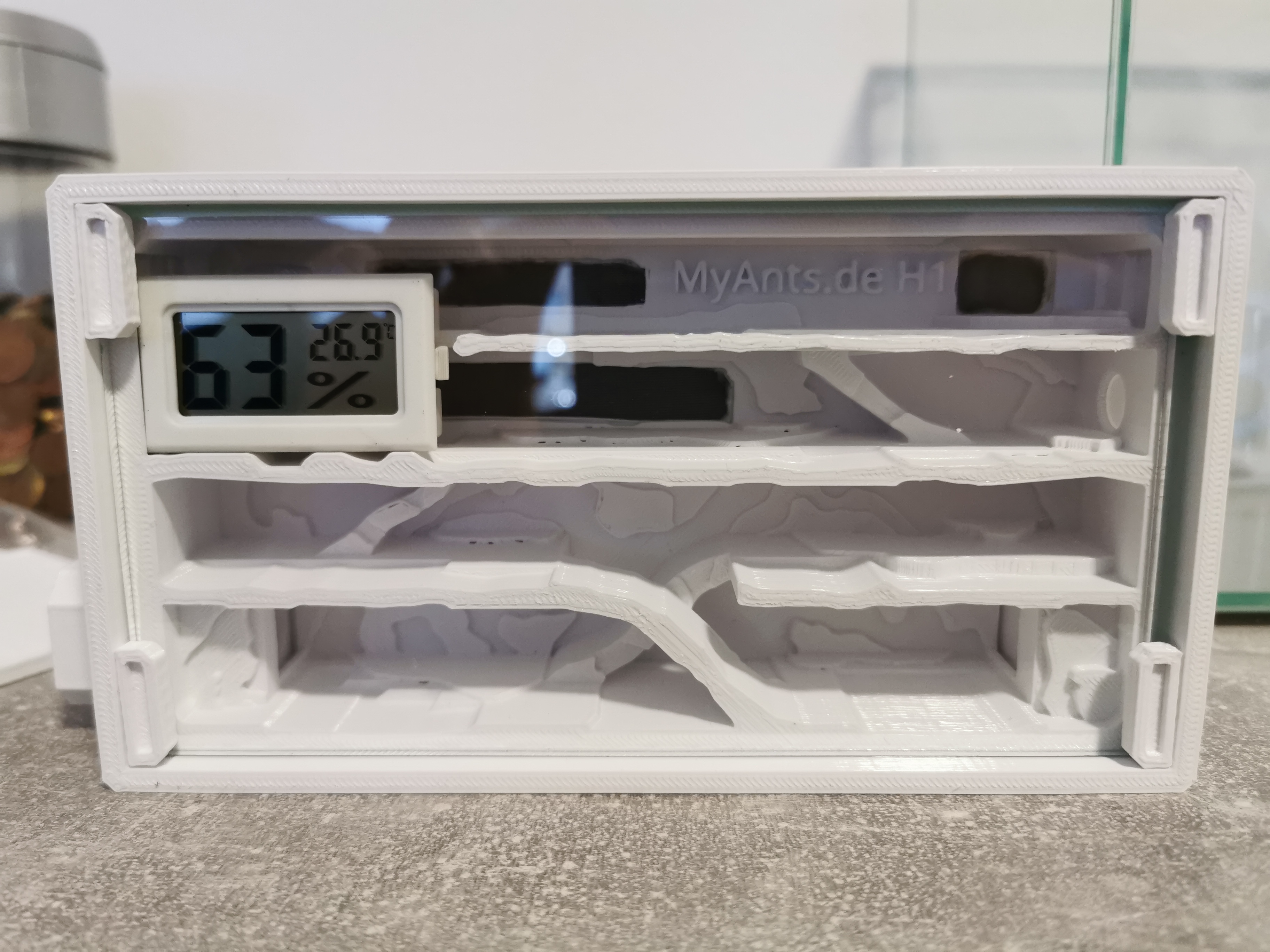 Es bietet ein Hygro/Thermometer, was ich eigentlich nicht unbedingt brauche, aber ein netter Bonus. Die Befeuchtung und Beheizung erfolgt von hinten. Ich werde es zunächst so handhaben, dass ich das Heizkabel nur an einer Seite befestige, damit die Ameisen eine Heterogene Temperatur und Feuchtigkeitsverteilung im Nest haben und sich so die besten Plätze für die jeweiligen Brutstadien aussuchen können.
