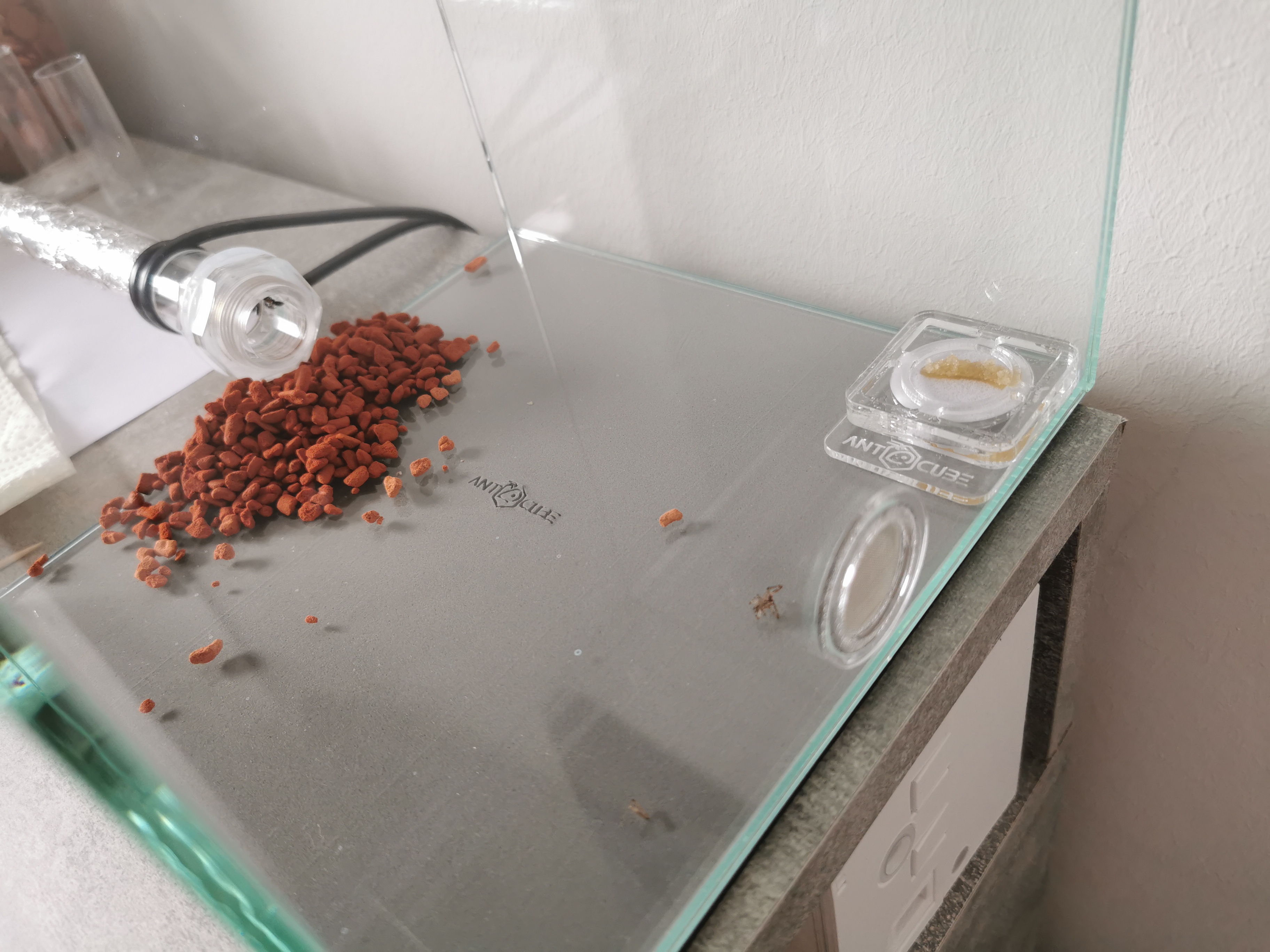 Das Setup 2.0 ist vorerst der Endstand bis zur Winterruhe. Am liebsten hätte ich Sand oder feinen Kies genommen, aber da die Ameisen darauf nur wenig halt haben, habe ich mich für mittelgroben Aquariumkies entschieden. Mir war wichtig, etwas zu nehmen was einen guten Kontrast zu den dunklen Ameisen bietet, damit man diese gut sehen kann.