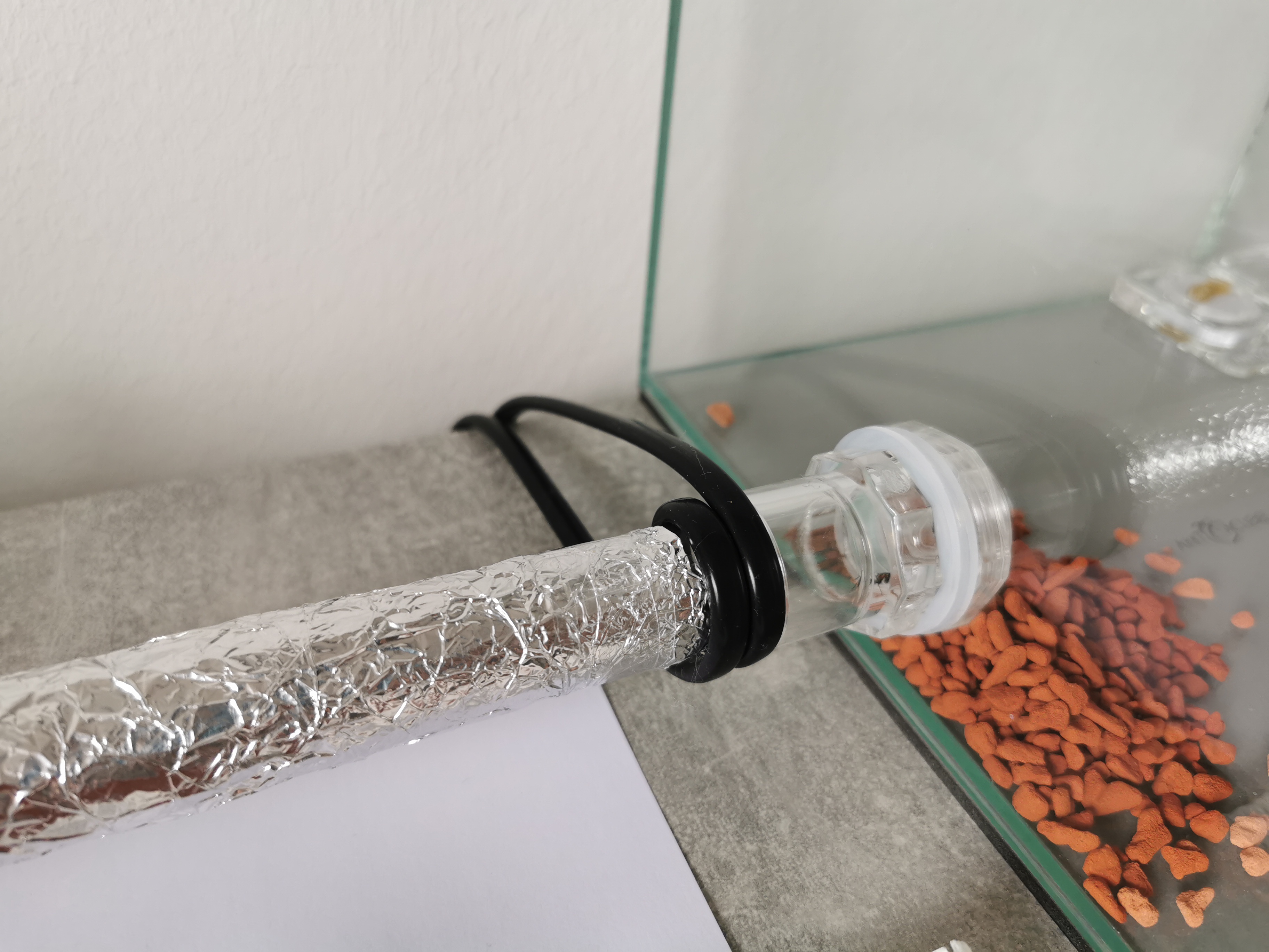 Ein noch recht simpler Aufbau mit der Möglichkeit das Röhrchen an die Arena anzuschließen. Dieses wird zunächst mit Alufolie bedeckt und ggfs. mit einem Heizkabel beheizt.