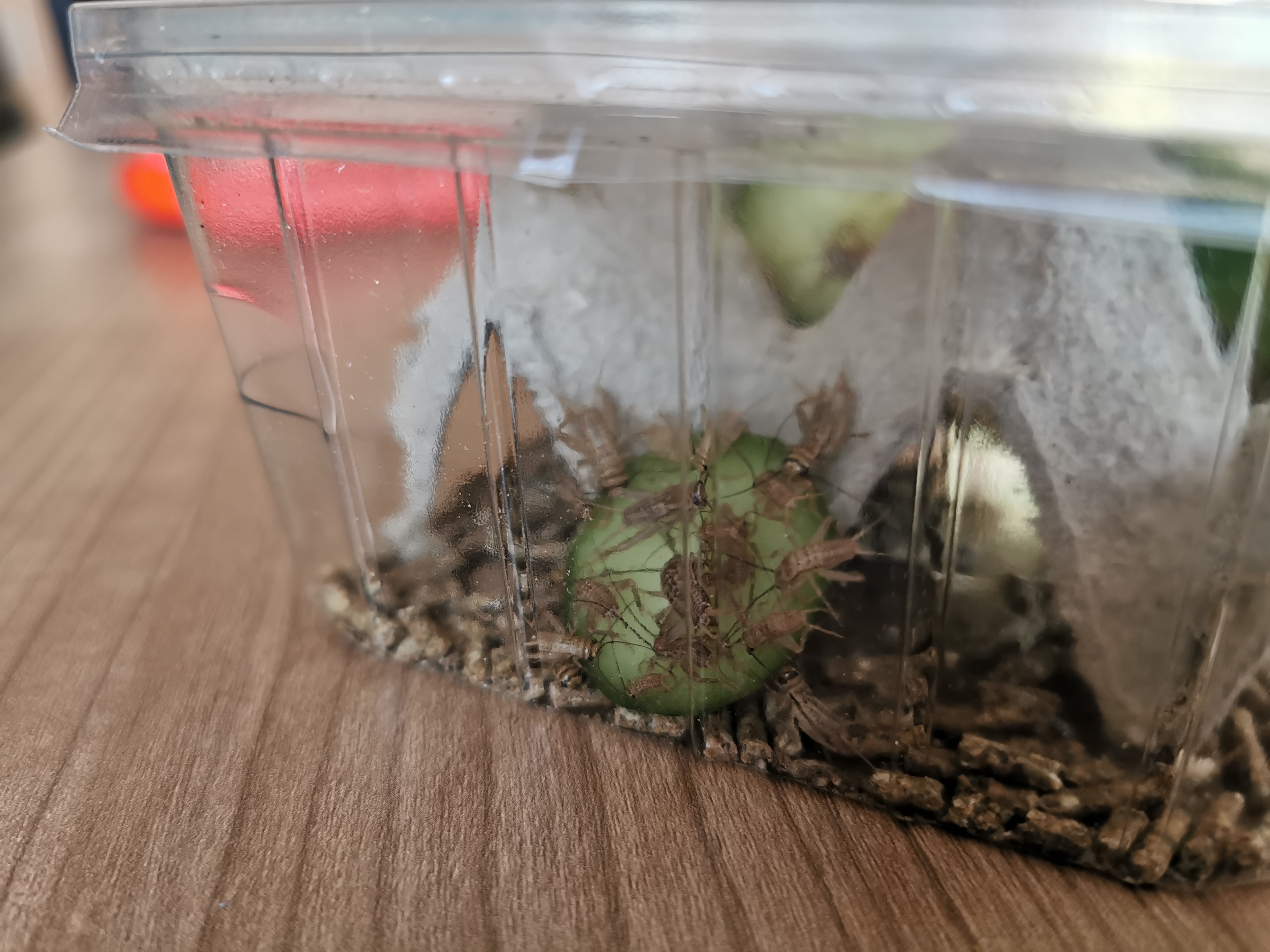Als Futter habe ich bisher immer auf Haushaltsbeiprodukte wie Spinnen oder Silberfischchen gesetzt. Um ein wenig Abwechslung in die Ernährung der Kolonie reinzubringen habe ich das ganze jetzt durch Heimchen und Fruchtfliegen aus der Zoohandlung ergänzt.