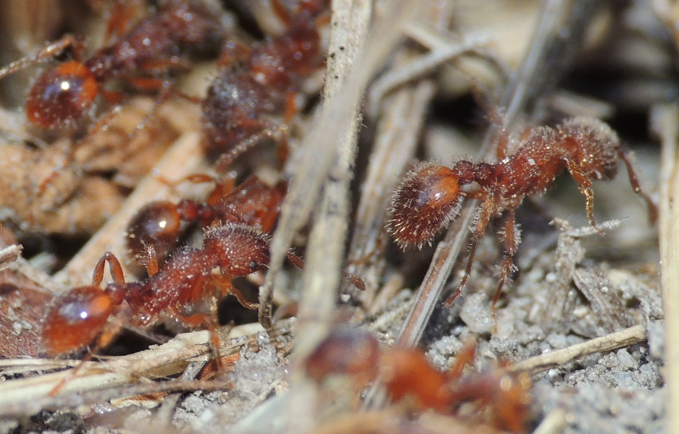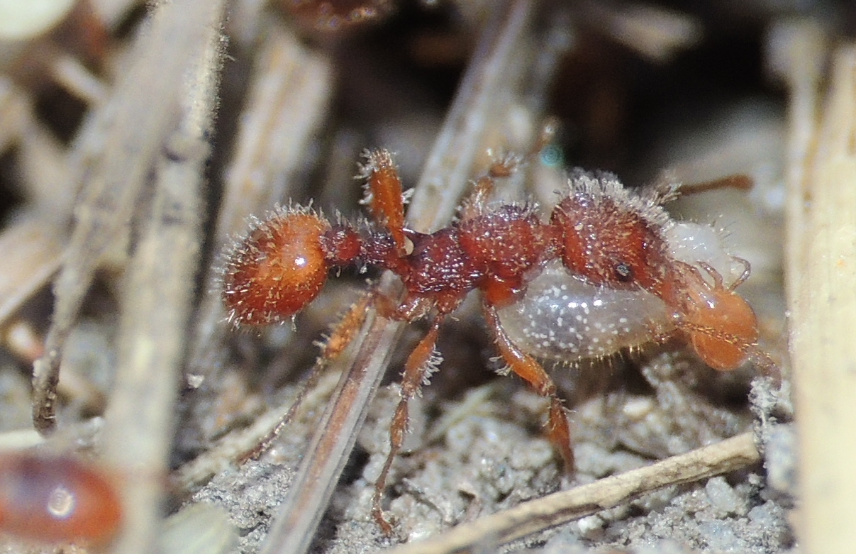 Bei meinen wöchentlichen Exkursion in Freie, meist am Sonntag Nachmittag, stieß ich dann auf verschiedene Myrmica Nester die stark mit Parasiten befallen waren. Ich machte mich im Internet schlau und fand schließlich heraus, dass es sich bei dem Befall um den Ektoparasitzen Rickia wasmannii handelt, ein Pilz der auf der Oberfläche verschiedener Myrmica Spezies wächst. U.a. präsentierte ich den Befund damals mit Fotos und Videobelegen im Nachbarforum Ameisenportal und der User und Fotograf Jumpstyle (http://ameisenfotografie.de/index.php?s=home) machte ein Fotostacking eines Rickia-befallenen Myrmica rubra Kopfs (https://www.ameisenportal.de/viewtopic. ... t=40#p9440).