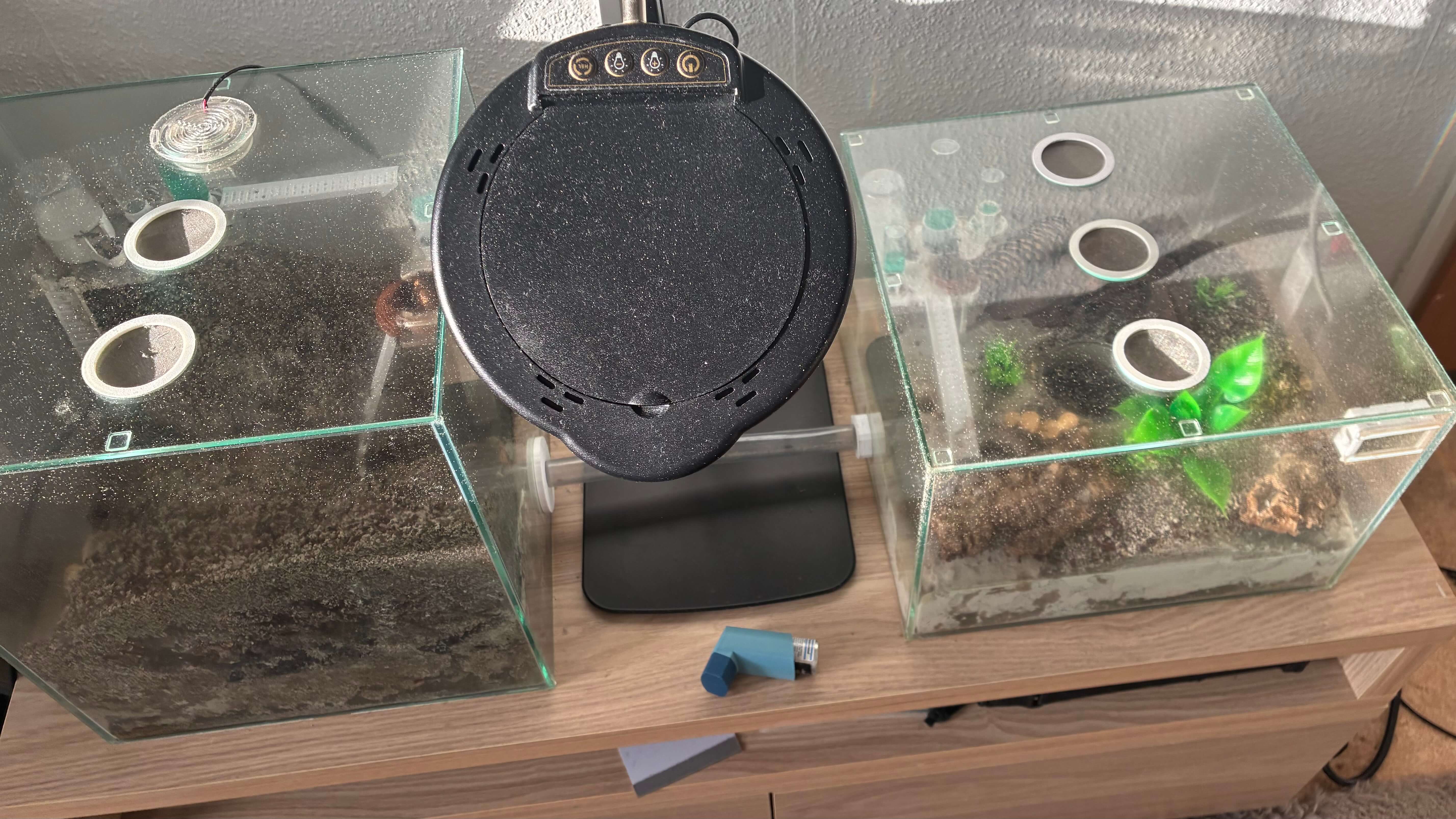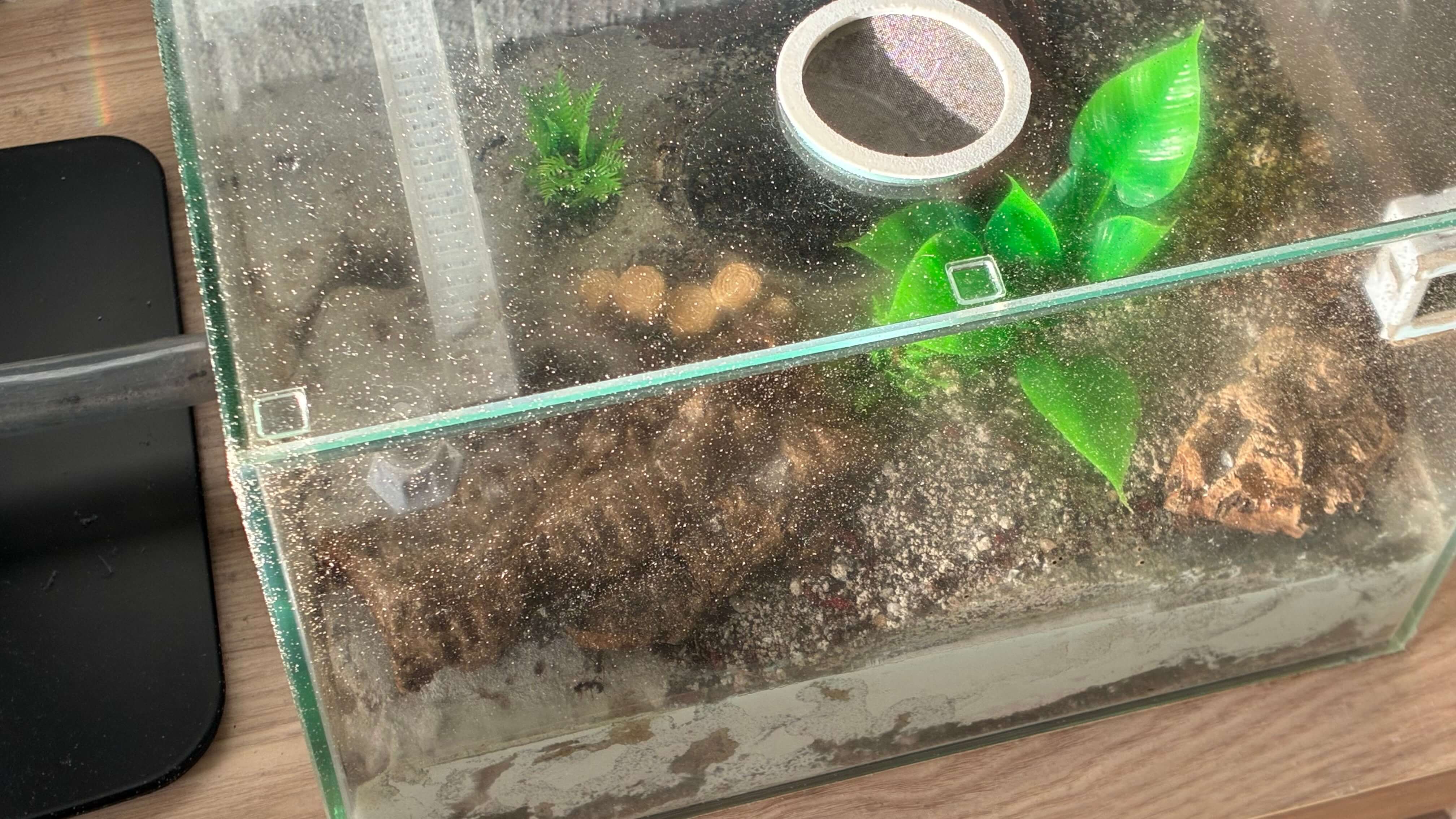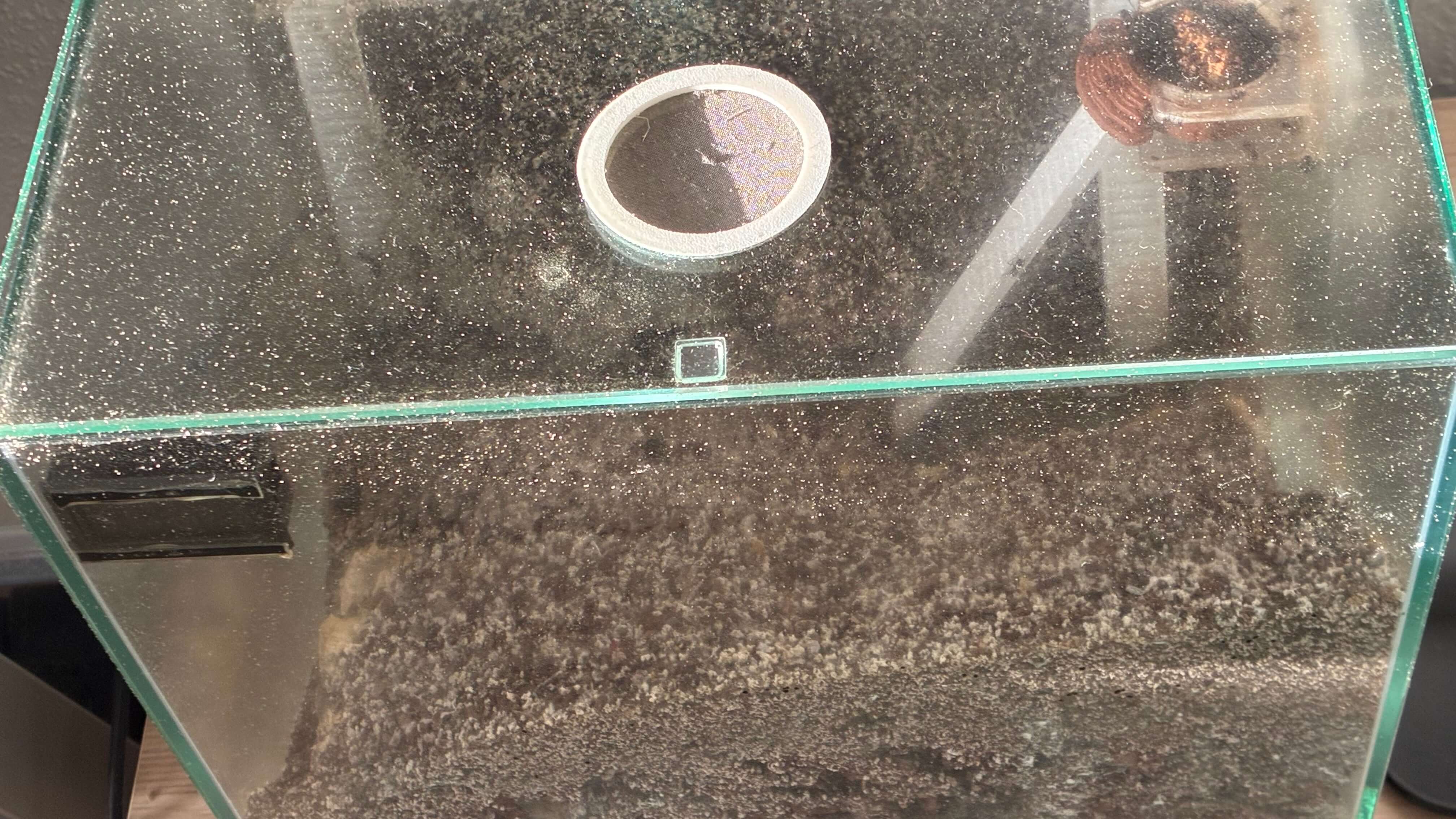 Wenn Du das Erdnest feucht halten muss, kannst, lieber Steine oder andere GegenstĂ€nde auf den Bodengrund legen, das reduziert die Verdunstung und Du kannst trotzdem das Becken offen lassen. So mache ich das derzeit bei meiner Solenopsis fugax Kolonie, die in einem groĂen Erdnest leben.