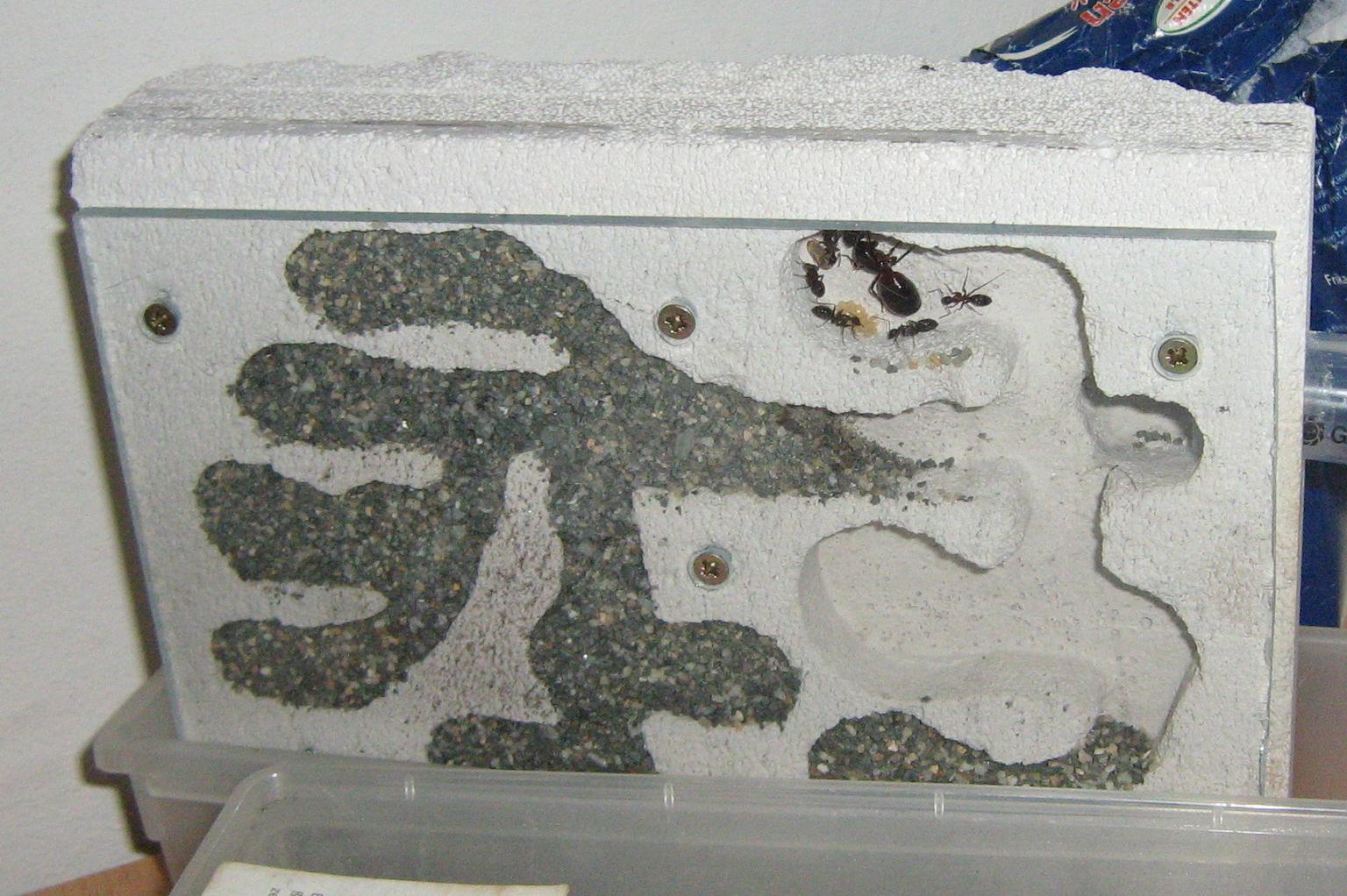 Das erste ist meine kleine Camponotus ligniperda und im zweiten meine grĂ¶ĂŸere Lasius niger-Kolonie. Dasdritte Bild das Nest in Groß.