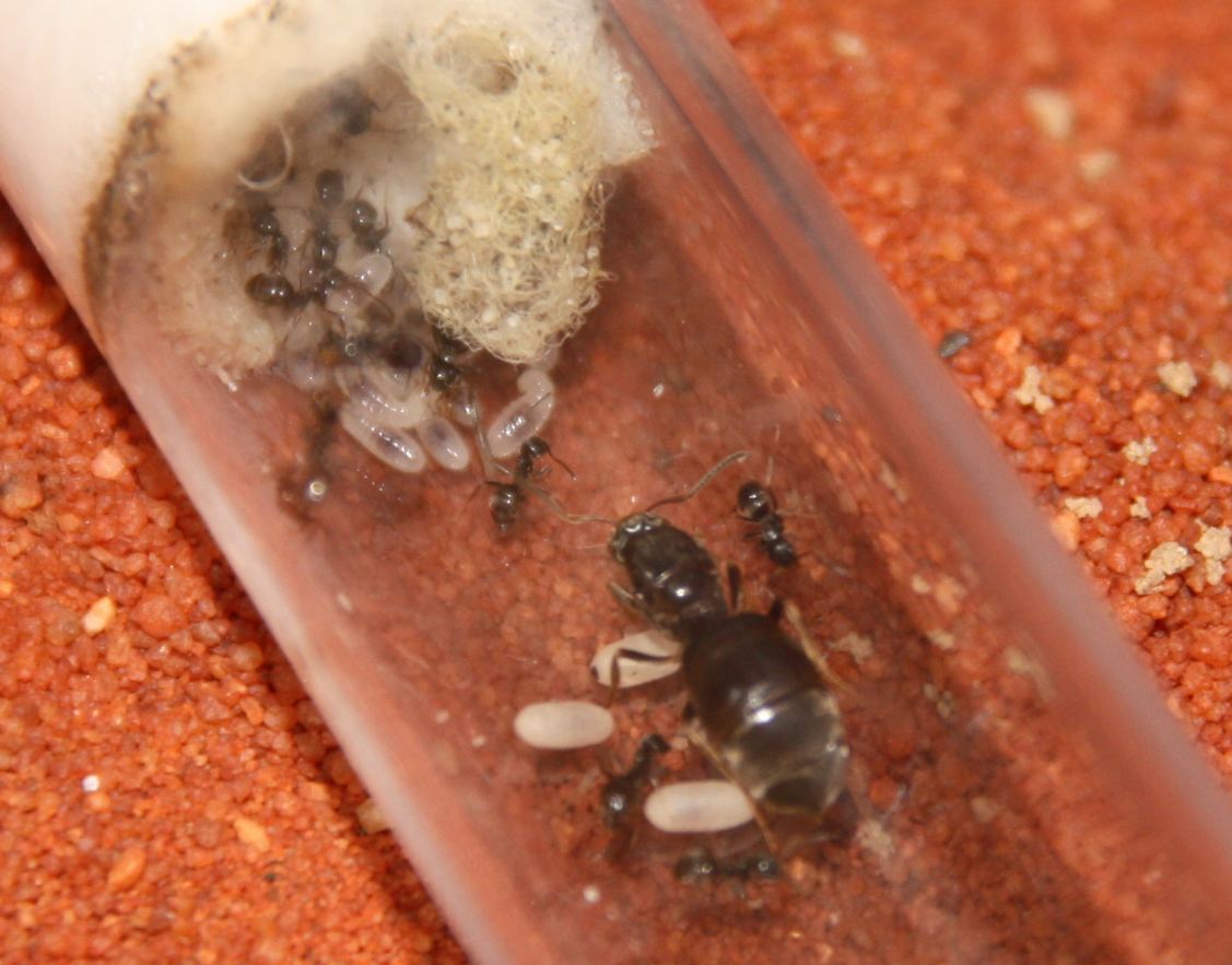 Ich hab eine Lasius niger Kolonie mit 9 Ameisen und Königin bekommen, dazu noch viele Eier. Das Reagenzglas hab ich einfach geöffnet und in die Arena gelegt, ein kleines Dach aus Roter Folie darüber. Dazu noch ein bisschen Honig angeboten, Wasserspender reingestellt.