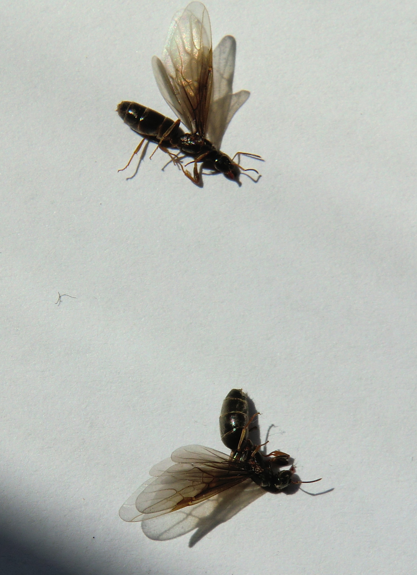 Um das noch einmal in Worte zu fassen: Lasius brunneus hat im Vergleich zu L. niger FlĂŒgel, die die Gaster (das ist der runde Hinterleib) deutlich ĂŒberragen. Dazu ist der Thorax (die "Brust", mit FlĂŒgeln und Beinen) von L. b. deutlich flacher, der von Ossein angesprochene Habitus erscheint insgesamt schlanker.