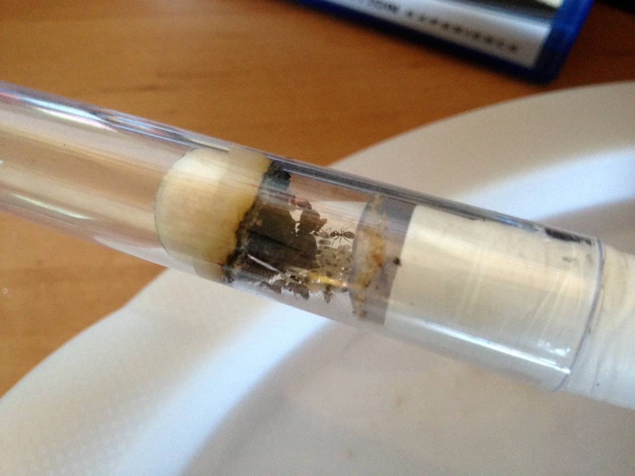 Da der Mini-Kühlschrank, in dem die Damen überwintern sollten, einen zu kleinen Durchmesser hat, um das neue Nest samt angehängtem RG zu behausen, habe ich vor einigen Minuten unter Litern von Angstschweiß das RG vom Schlauchende abgedreht, das Ende des Schlauches mit einem Gummistopfen verschlossen und die drei verbleibenden Ameisen vom RG in die Arena geschüttet.