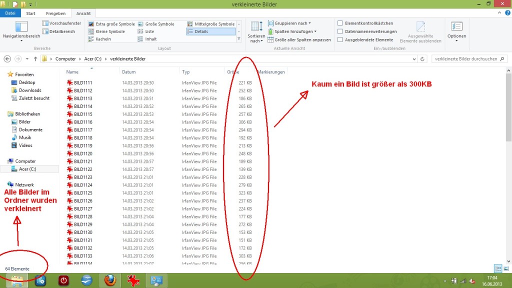 Also nochmal: Es gibt Irfanview und damit kann man hunderte Bilder auf einmal verkleinern und zwar nur mit zwei Klicks(âaddallâ und dann âStart batchâ) sobald man einmal alle Einstellungen vorgenommen hat.