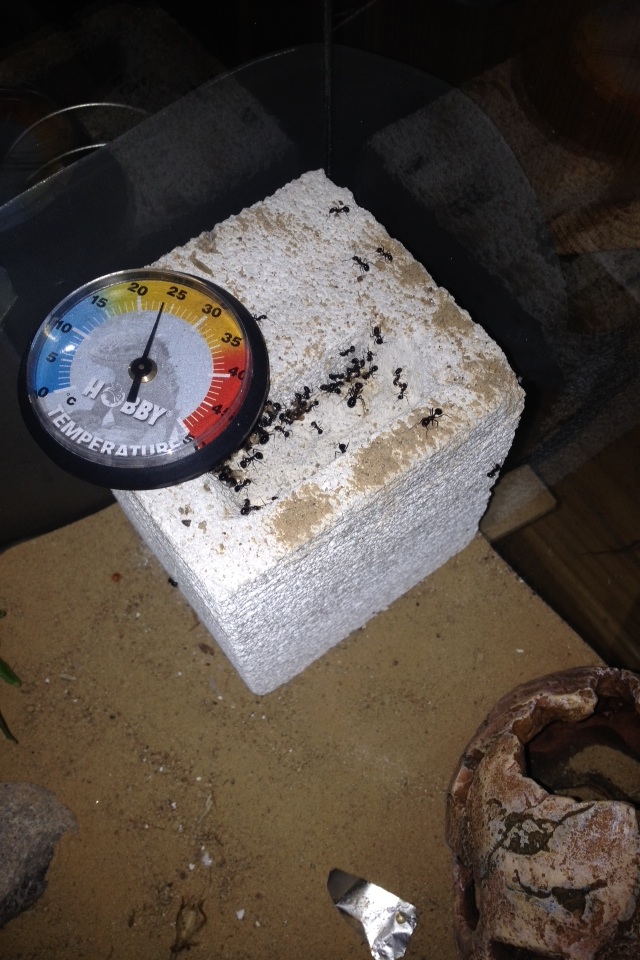 Da die Kolonie seit dem Unfall mit dem Tankwasser nurnoch aus 3 Ameisen besteht: Jop die ganze Kolonie sitzt darauf (gerade nur 2, die Gyne und eine Arbeiterin)