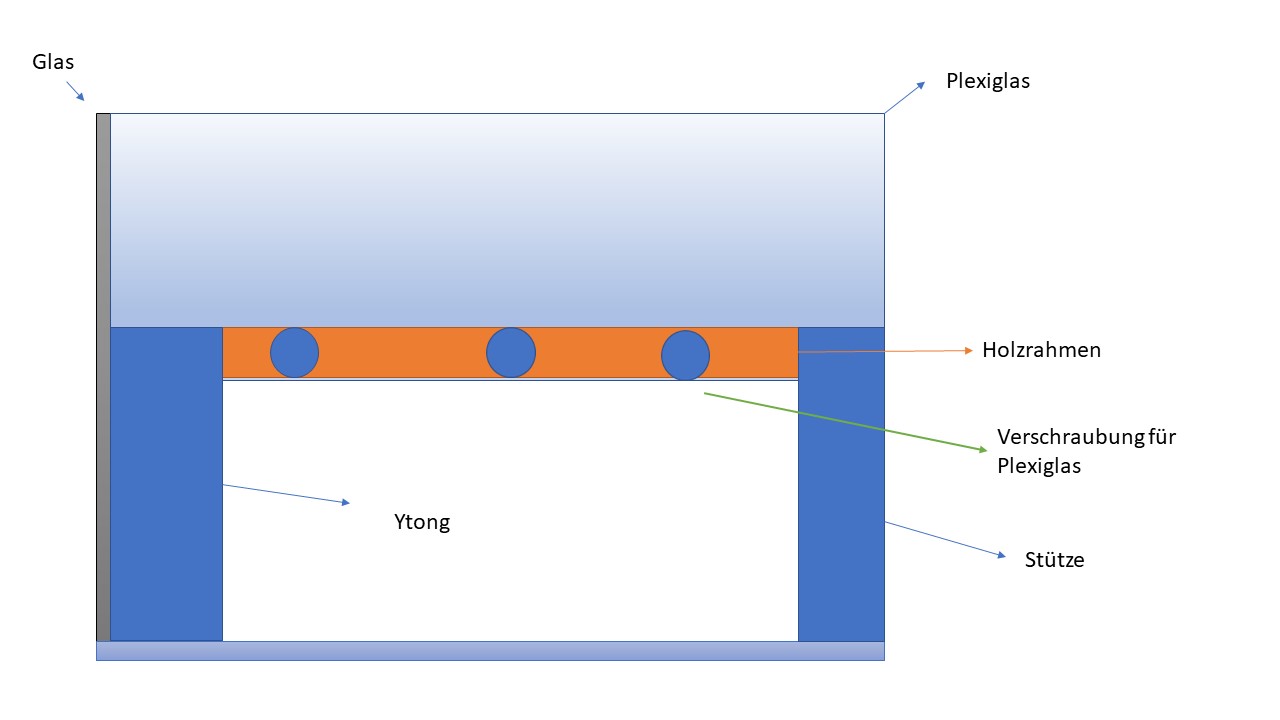 obendrauf eine Platte aus Plexiglas (600x600), hinten in die Ecke eine Stütze, damit die Platte nicht nachgibt