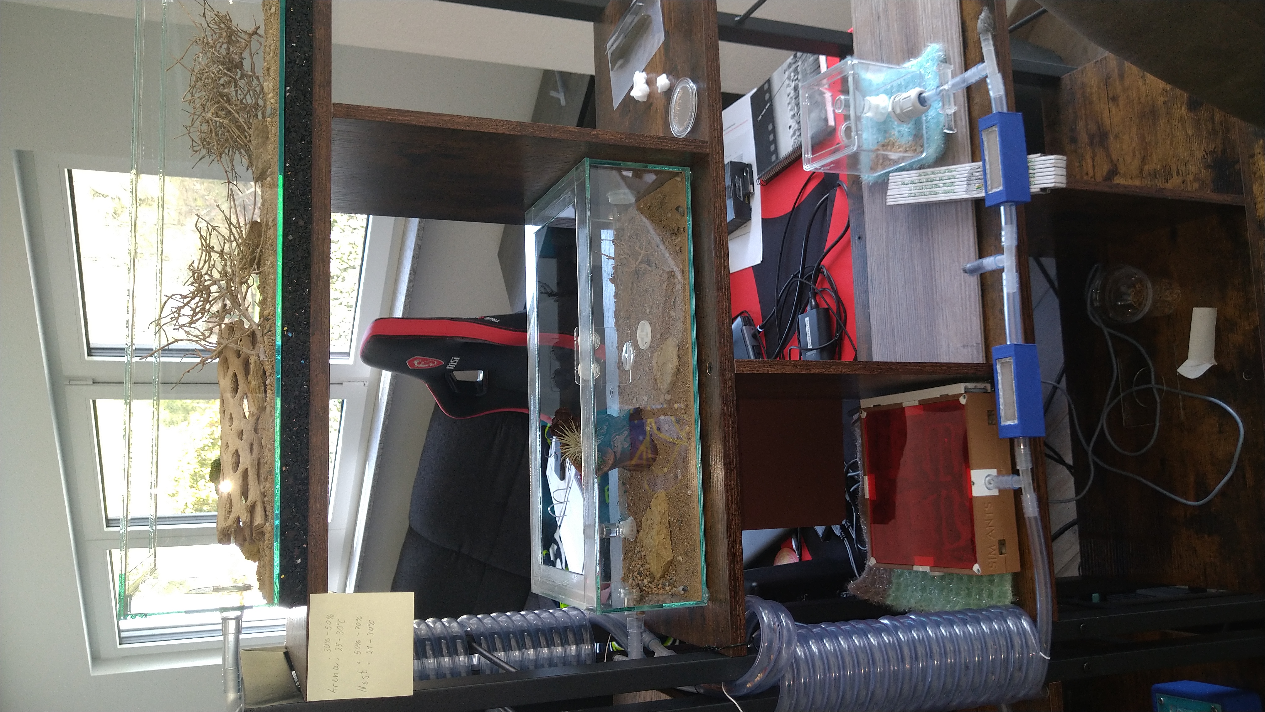 So steigt die Luftfeuchtigkeit nicht ins unermessliche wenn ich die Nester befeuchte. Soll auch verhindern das die Körner keimen oder gammeln. Bisher klappt das ganz gut. An manchen Stellen wird der Schlauch jetzt aber doch leicht milchig, allerdings nicht in der Näher der Lüftungskästchen.