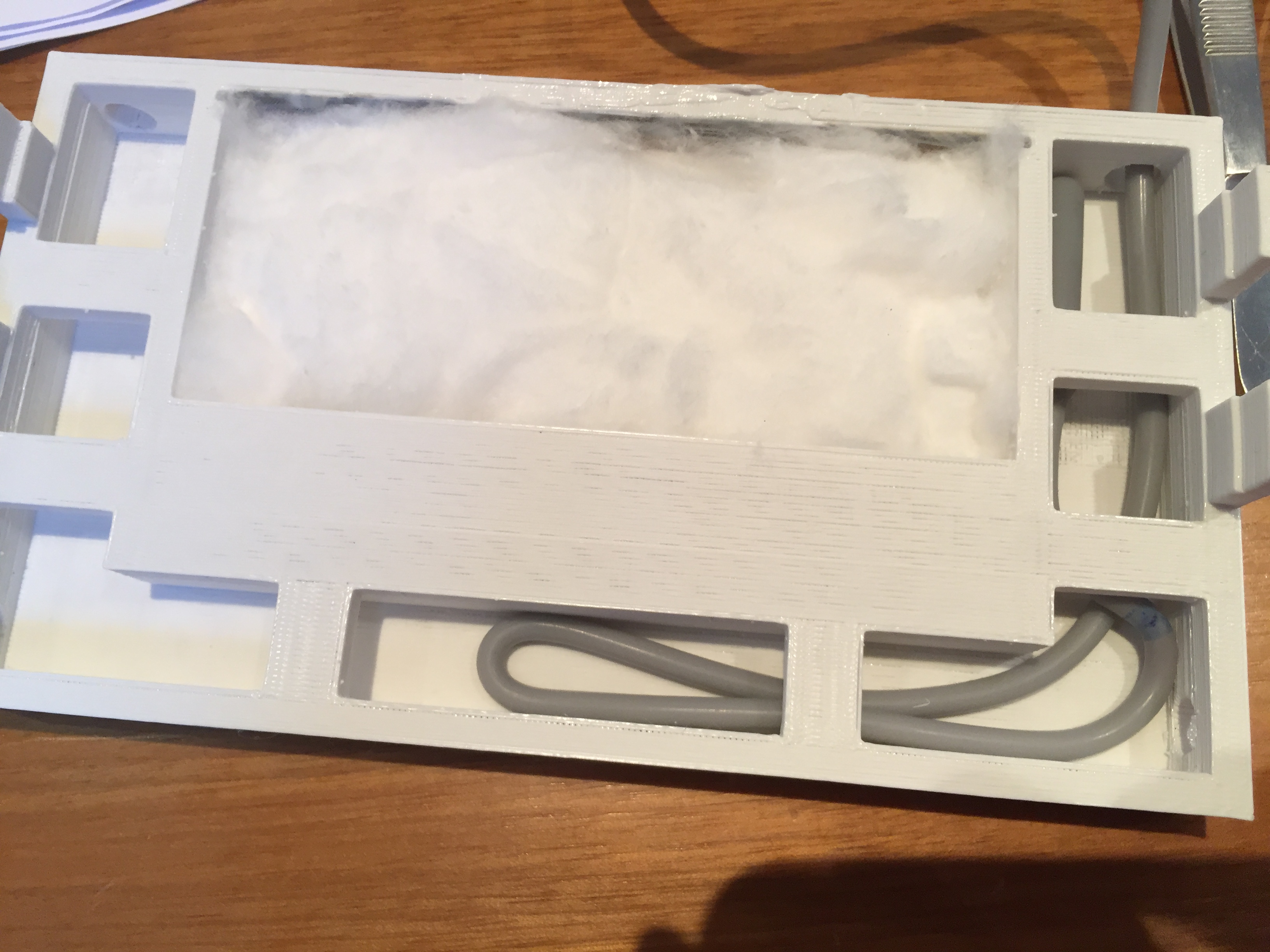 Das muss mit dem Endstück durch das Loch (erstes Bild rechts unten), dann ziehst du die gewünschte Menge Heiz-Kabel nach (je mehr desto wärmer) und verlegst es in dieser Kammer (1-fach, 2-fach, 3-fach, wie du magst).