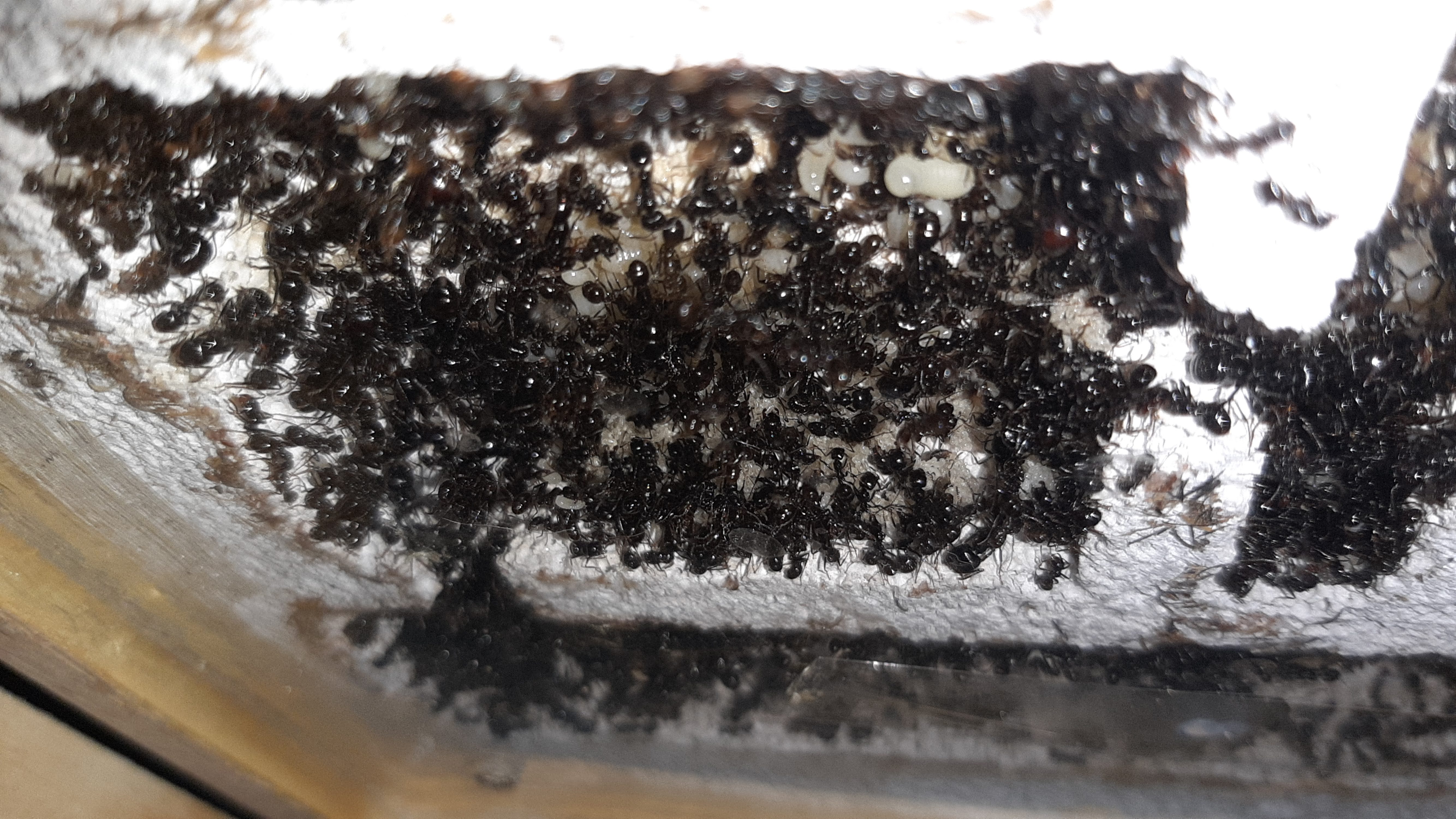 Ich weiß nicht wie gut man das erkennen kann, aber an der hinteren Kammerwand ist alles voller Eier, das ist locker ein Esslöffel nur Eier und daher wird viel gebraucht momentan und das ist nur eine der 3 Brutkammern die sie gerade nutzen