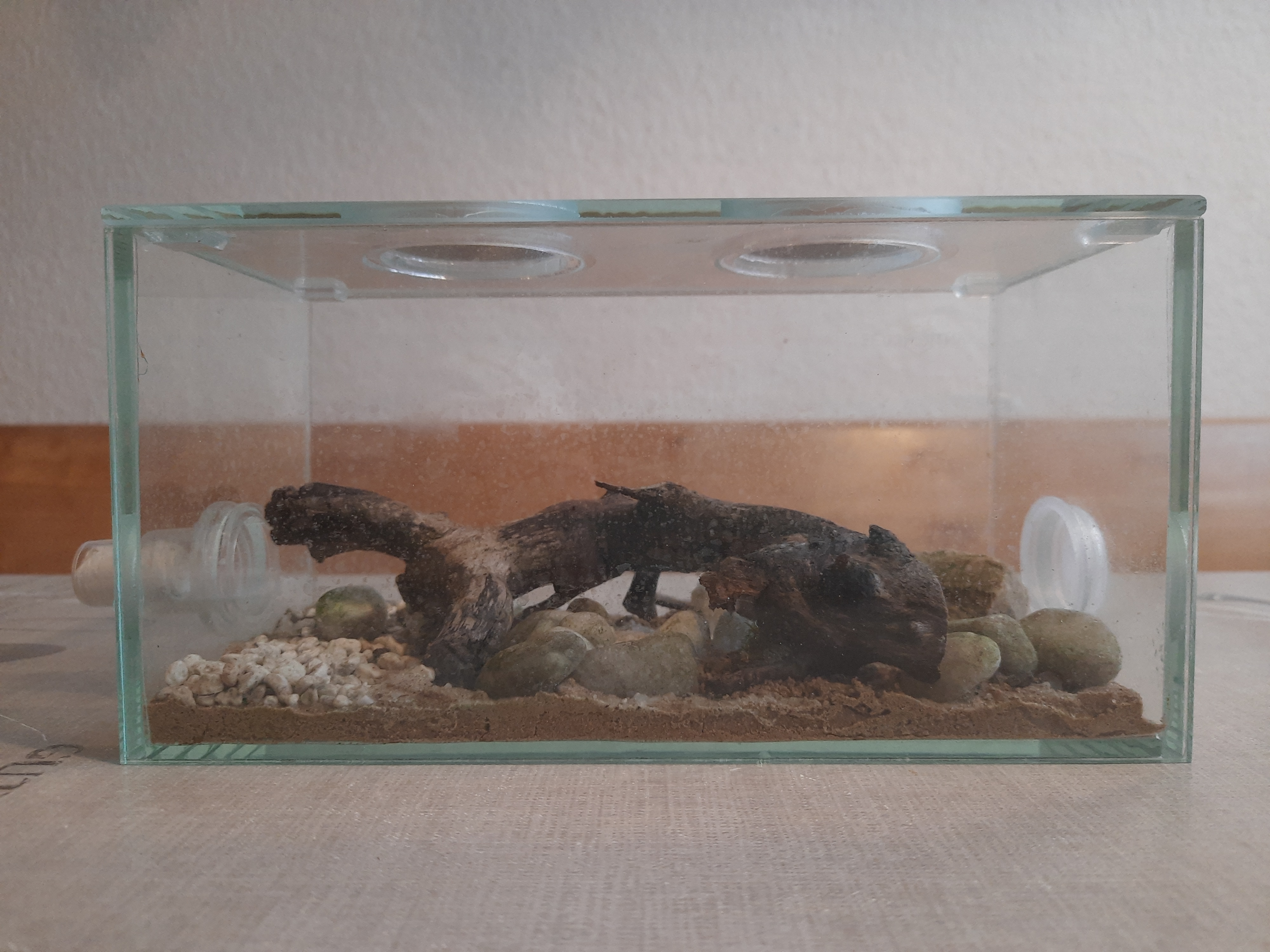 Habe nochmals ein Bild von der Seite gemacht, wo man die Dicke des Bodengrunds besser erkennt. Sehr dick ist es nicht, aber unserer Königin war so schlau, ihre Kammer unter den Steinen rechts im Bild zu machen, so konnte sie die komplette Höhe von Steinen bis zum Boden nutzen und hat uns ermöglicht, von unten durchs Glas ein wenig reinzuspickeln.