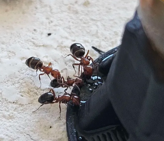 2) Kürzlich erhielt ich eine Gründerkolonie davon, und ich machte da eine doch recht interessante Beobachtung, die mir zuvor noch nie unter kam. Und zwar hat die erste Pygmäe, letzte Nacht, in der kleinen Arena den Tropfen Zuckerwasser gierig abgenommen, und auch den zweiten Tropfen, den ich noch hinzufügte. Heute sehe ich, wie dieGyne und Pygmäe mit Brut das RG-Nest verlassen hatten und sichs in der Arena gemütlich machten... der Blick ins ursprüngliche RG-Nest zeigte mir ein interessante Bild: Sämtliche kleine bis winzige Zuckerwassertropfen bedeckten den "Bodenbereich" komplett, als hätte die Pygmäe über Nacht den Überschuss hier sorgfältig mosaikartig zerstreut zwischengelagert. Zumindest muss das der Auslöser für den Umzug gewesen sein, die Arena selbst steht halbschattig und ist wirklich winzig gehalten.
