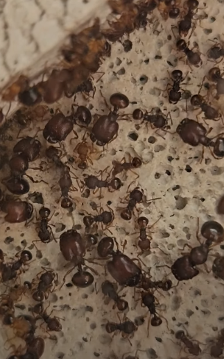 Das funktioniert problemlos und die Acanthomyrmex entwickelt sich insbesondere durch Zuckerwasser sichtbar gut (Ei-Ablage, verteilte Individuen im Nest, mehr Aktivität).