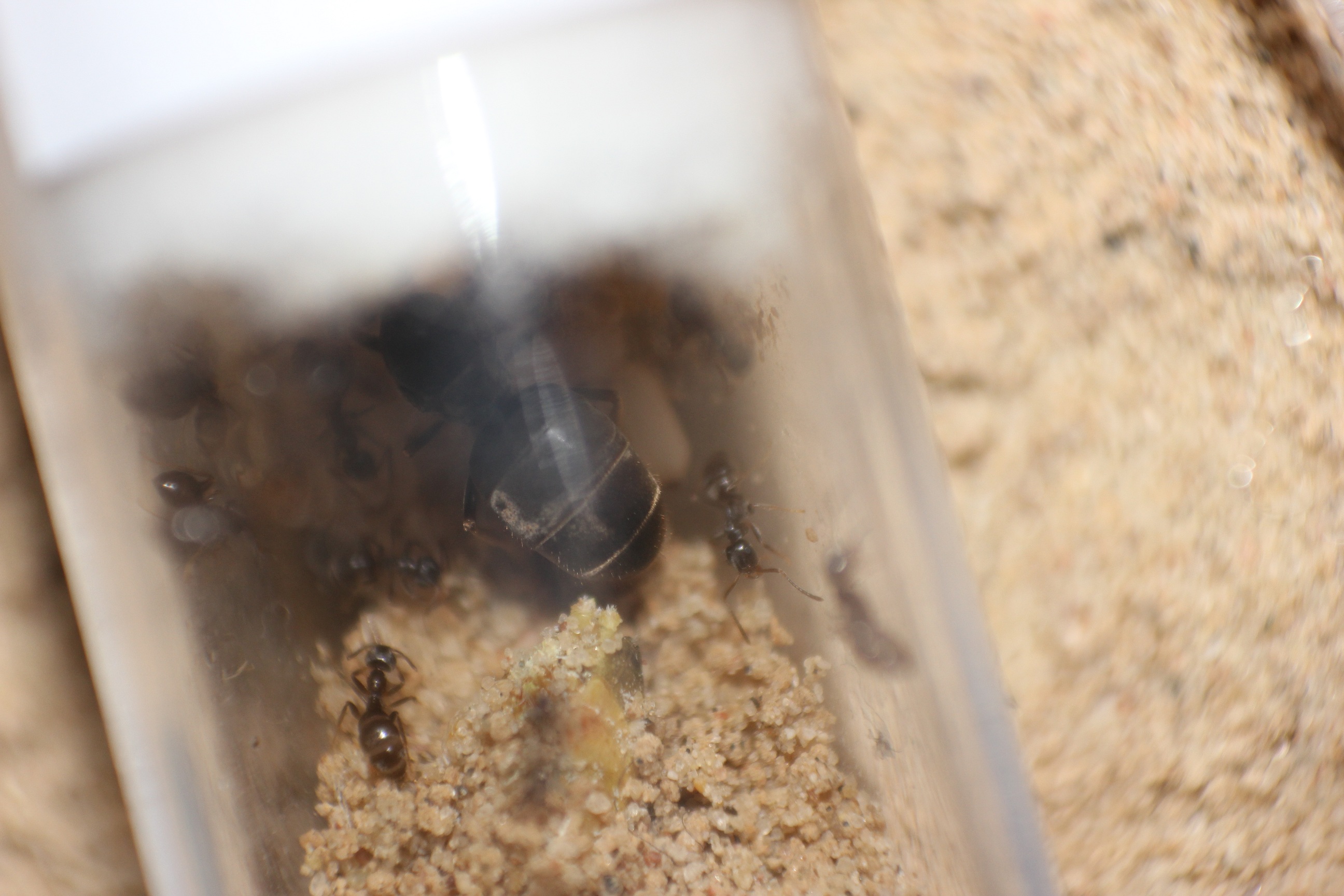 Nein, ansonsten verhalten sich alle normal. Es wird viel getrunken und gegessen und seit zwei Tagen ist die kleine Kolonie auch richtig aktiv in der Arena. Oft sind sieben, acht oder gar neun Arbeiterinnen unterwegs. Von "nur" 20 an der Zahl doch eine gute Menge. Die meisten schleppen zwar nur Sand hin und her aber so aktiv hatte ich sie bisher nicht erlebt.