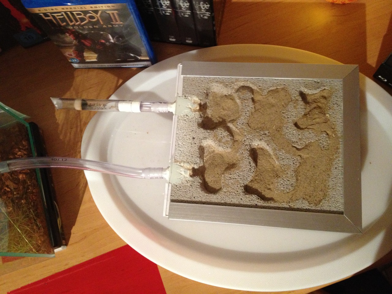 Es ist ein Nest mit 6 Kammern, vier davon noch mit Sand ausgefĂĽllt. Um zwei Kammern unterschiedlich feucht zu halten, kann ich es nur nach links oder rechts kippen und das macht wenig Unterschied.