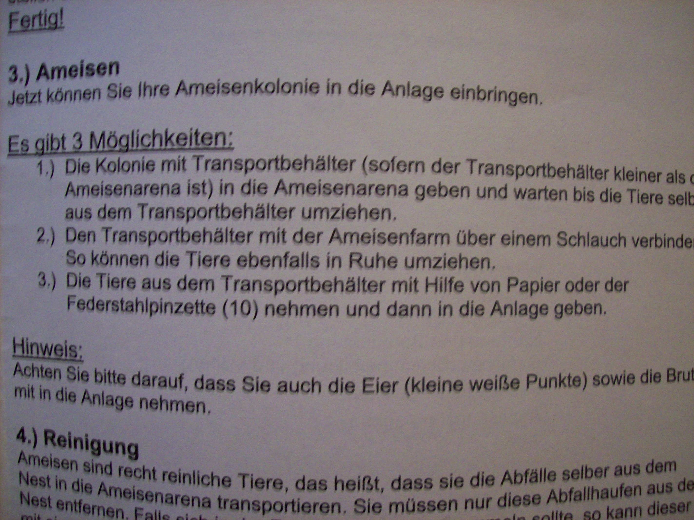 Darf ich kurz fragen, von welcher Anleitung du sprichst? Meinst du das Heft "Grundlagen der Ameisenhaltung"?thachefsalatmc hat geschrieben:Laut Antstore Anleitung: "Es gibt 3 Möglichkeiten........
