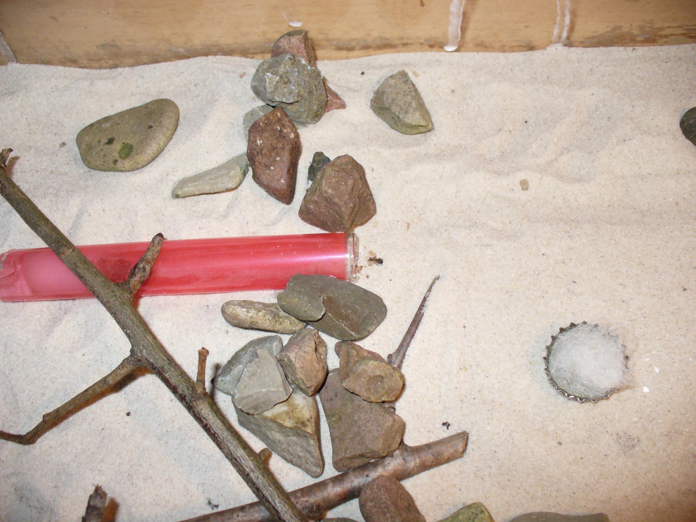 Den Arenaboden kannst du mit kleinen Kieseln noch etwas grober machen, damit die Meisen besser drauf laufen können. Wenn du ihn mit so einer Wassernebelspritze besprĂŒhst und es abtrocknen lĂ€sst, "verkleben" sich die Körner etwas, sodass der Belag auch etwas fester wird.