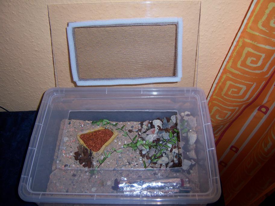 Mit dem Deckel hast du Recht, da kommt wohl jede einheimische Art durch die Schlitze. Aber von der Optik her gefällt mir der Deckel, und ich glaube er ist auch ein guter Mittelweg um Feuchte drinnen zu halten und gleichzeitig genügend Luftaustausch gewährleistet ist.