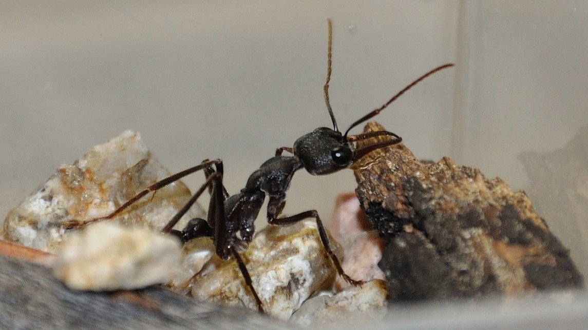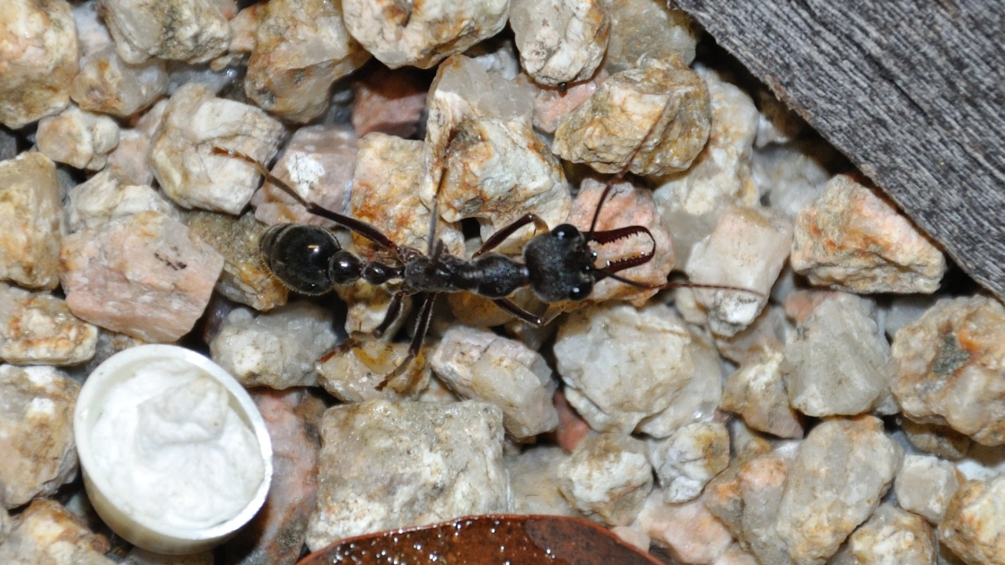 Ich moechte Euch heute die Neuigkeiten von meiner Treppenhaus-Myrmecia mitteilen. Sie hat erfolgreich das Wochenende in meinem Kleinst-Formicarium mit Honig und Wasser ueberstanden. Zudem hat sie die Landschaft (groessere Kiesel, Blaetter und Rinde) neu gestaltet. Ich konnte heute bessere Fotos schiessen (siehe Anhang) die evtl. eine genauere Spezifizierung moeglich machen.
