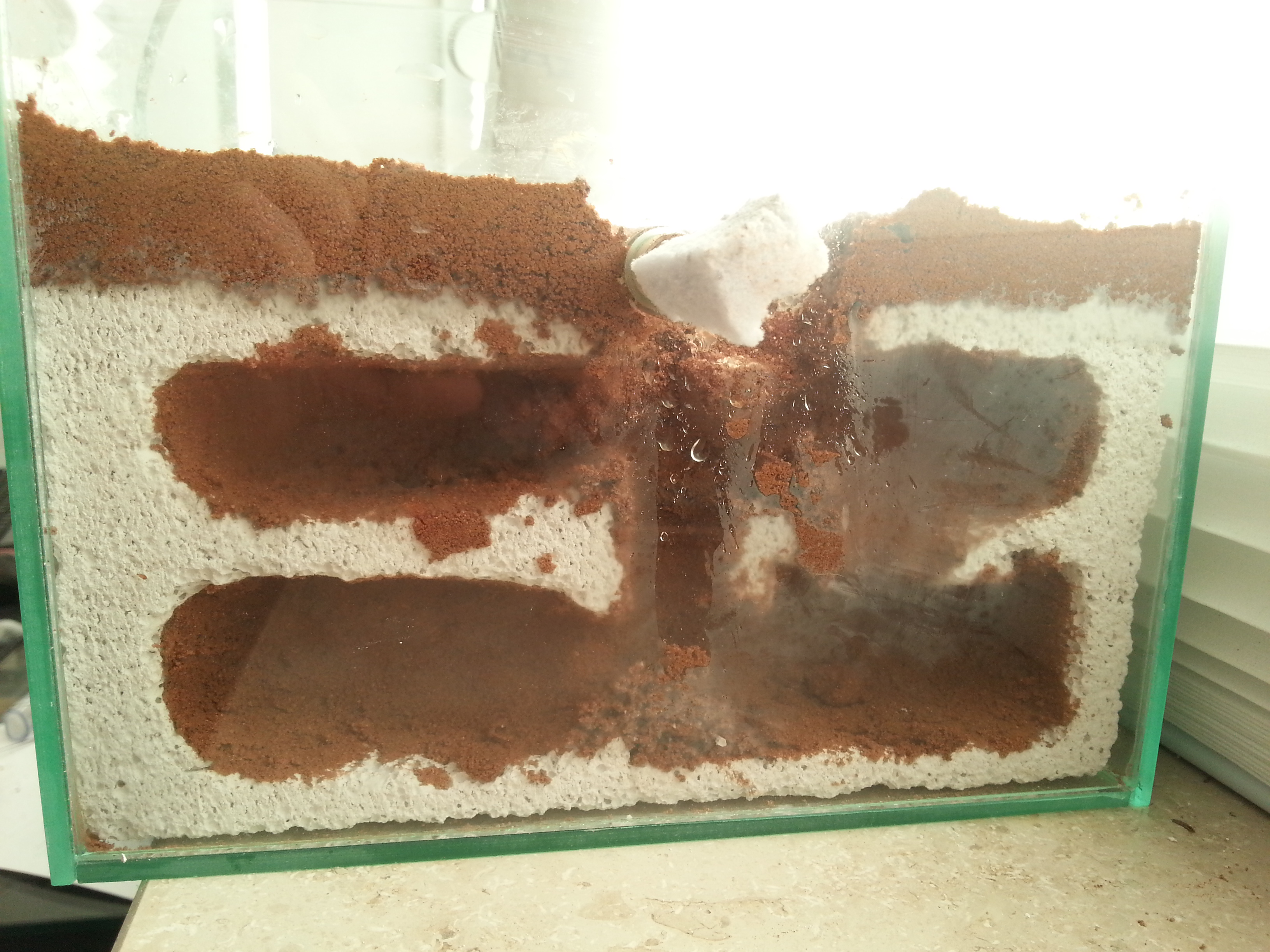Also, ich habe die ganze Anlage neu aufgebaut. Es gibt nun kein externes Ytongnest mehr, sondern ein in der Arena integriertes. Es ist nun eine große Spielwiese für die Ameisen. Sie dürfen Buddeln wo sie wollen und tuen das auch fleißig.
