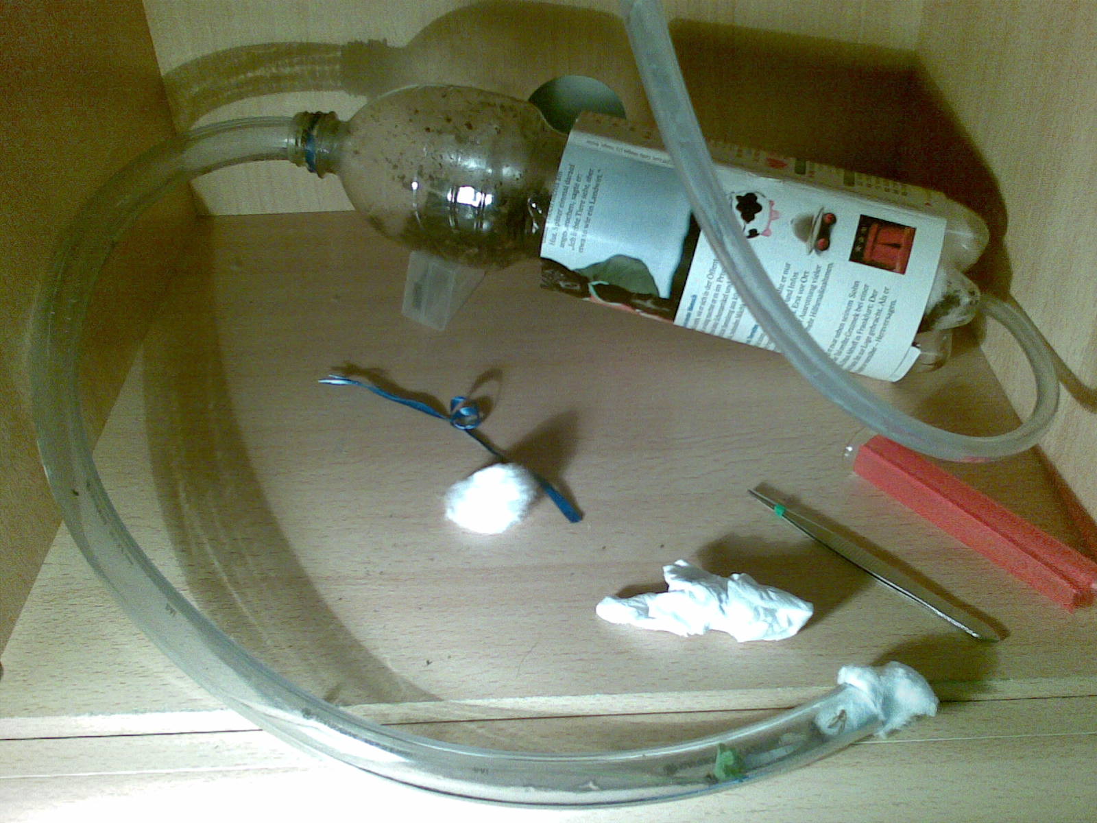 ich GLAUBE ich habe eine Gyne gefunden und diese mit einer Arbeiterin anfangs in ein Reagenzglas gesteckt. Ein paar Tage später habe ich mir jedoch überlegt das Paar umzusiedeln und sie in eine zur Hälfte mit Erde gefüllt Plastikflasche umgesiedelt. daran habe ich an der Öffnung einen Schlauch angesetzt, um sie dort zu beobchaten und mal etwas Honig hineinzutun. Am Boden der Flasche ist ein kleiner Schlauch über den ich hin und wieder etwas Wasser reinlasse. Das Problem is nun, dass beide Ameisen sich oft im Bereich der Öffnung des Schlauchs aufhalten, die mit Watte abgeschlossen ist.