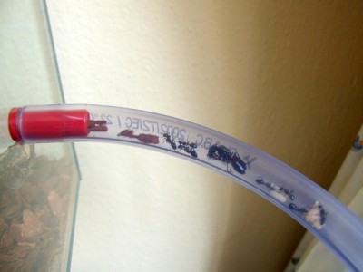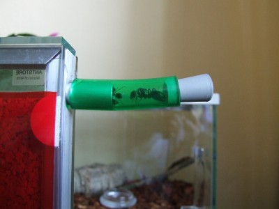 [font=Arial]Erkundungsausflüge in das Korknest waren nur selten zu beobachten. Nachdem sich die Kolonie komplett in den Alustutzen zurückgezogen hatte, habe ich das grüne Schlauchstück entfernt und das Nest mit klarem Schlauch mit der Arena verbunden. Sofort lugte eine Arbeiterin neugierig aus dem Stutzen. Innerhalb weniger Minuten war sie dann mit zwei weiteren schon in der Arena und inspizierte gründlich die Einrichtung. Kurze Zeit später machte sich der Rest incl.