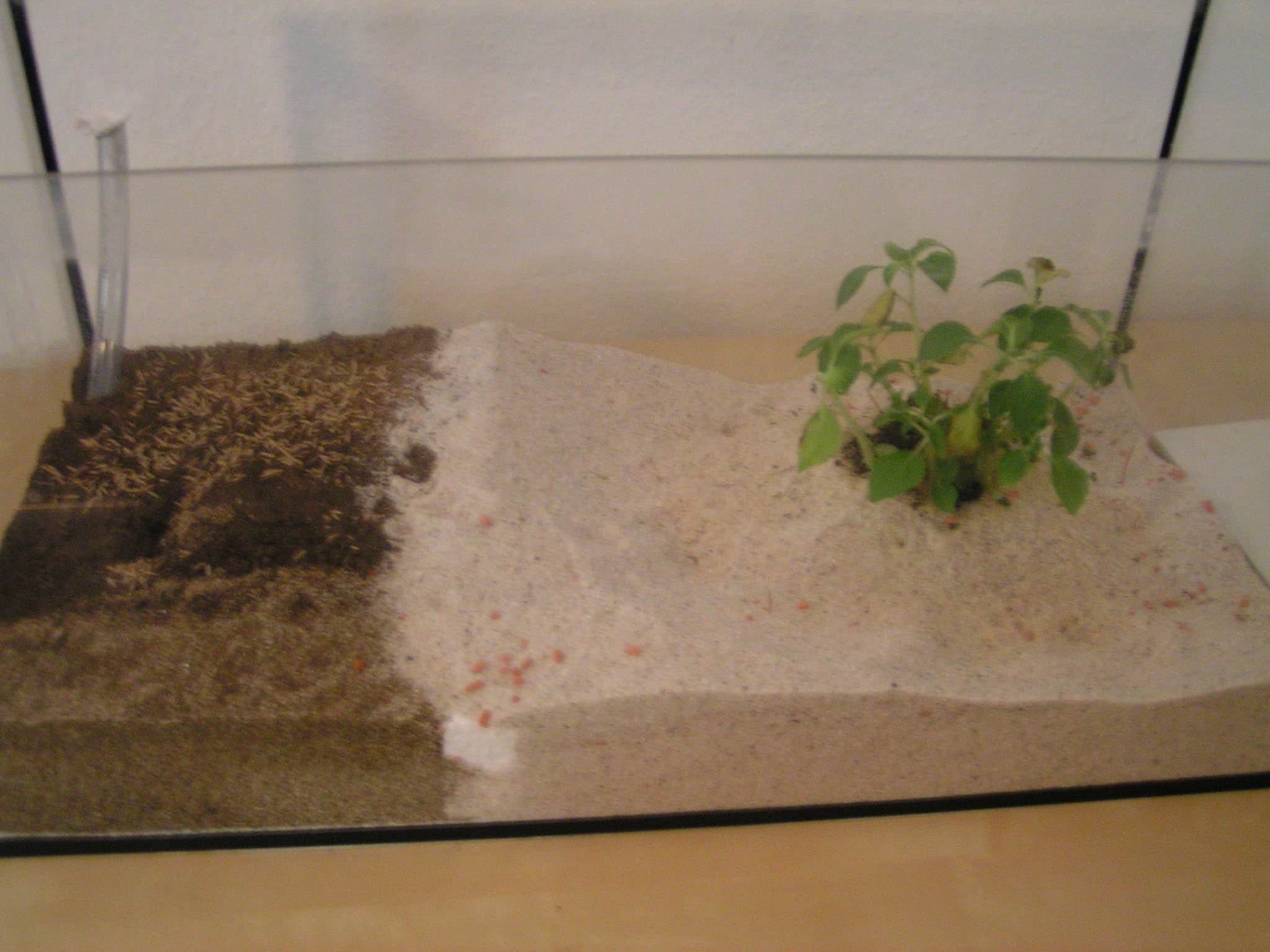 Halte die kleinen seit diesem Jahr in einem Erdnest (Sand/Lehm) in einem alten Aquarium(60cm*30cm*30cm), wobei keine Möglichkeit besteht, ins innere des Nestes zu schauen. Das ganze war ohnehin mehr eine Notlösung, wollte die kleinen aus dem RG-Nest haben, hatte aber noch kein Nest/Formicarium vorbereitet. 1/3 der Bodenfläche ist mit Sand/Lehm gefüllt(hab mit nem Stift einen Gang vorgegeben) der Rest einfach mit Sand, ne kleine Pflanze(50cent aus dem Baumarkt) ist auch noch drin.(ziemlich lieblos; Schande über mich)und ein Schlauch zum bewässern.